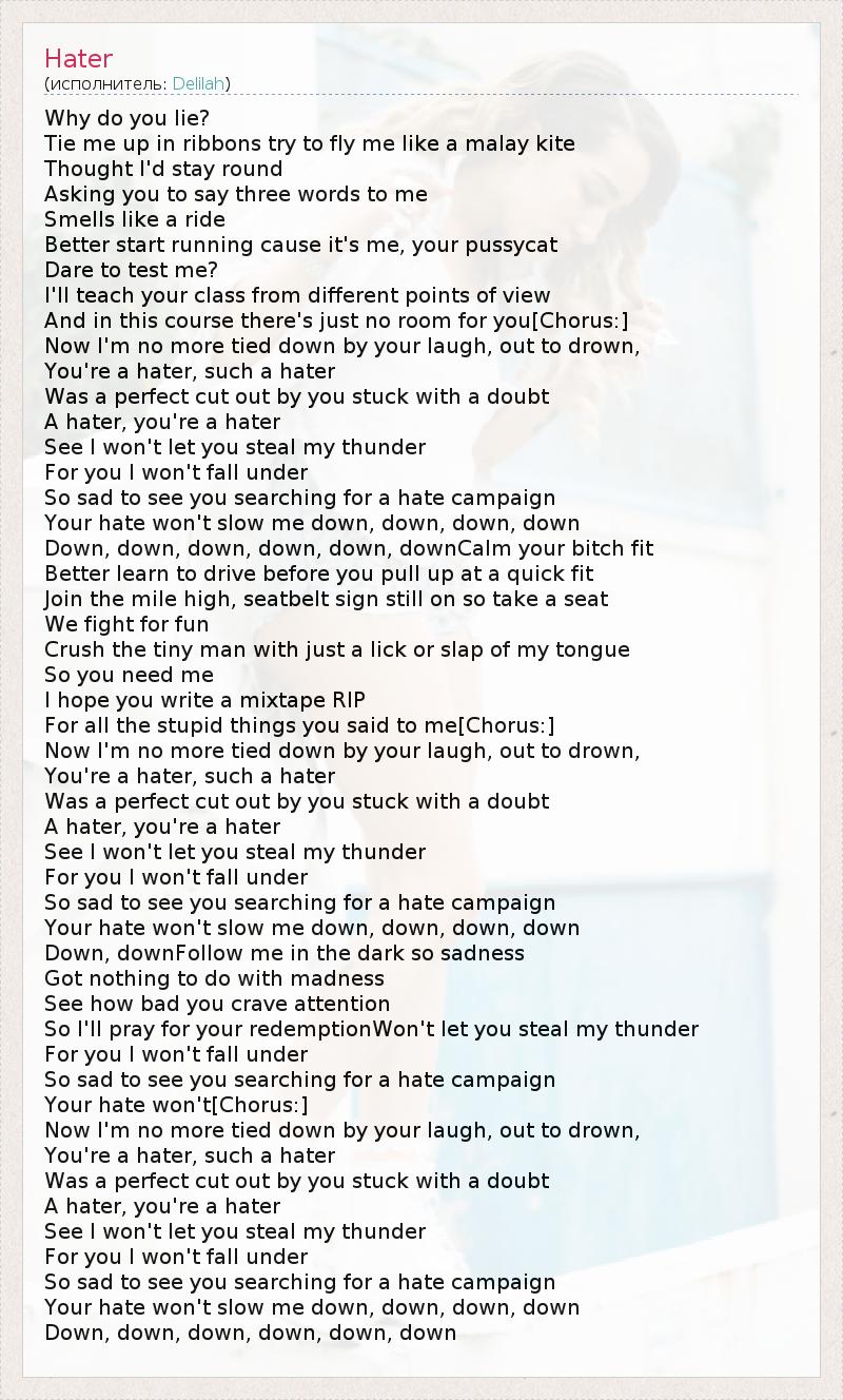 Why do you lie? Tie me up in ribbons try to fly me like a malay kite Thought I'd stay round Asking you to say three words to me Smells like a ride Better start running cause it's me, your pussycat Dare to test me? I'll teach your class from different points of view And in this course there's just no room for you[Chorus:] Now I'm no more tied down by your laugh, out to drown, You're a hater, such a hater Was a perfect cut out by you stuck with a doubt A hater, you're a hater See I won't let you steal my thunder For you I won't fall under So sad to see you searching for a hate campaign Your hate won't slow me down, down, down, down Down, down, down, down, down, downCalm your bitch fit Better learn to drive before you pull up at a quick fit Join the mile high, seatbelt sign still on so take a seat We fight for fun Crush the tiny man with just a lick or slap of my tongue So you need me I hope you write a mixtape RIP For all the stupid things you said to me[Chorus:] Now I'm no more tied down by your laugh, out to drown, You're a hater, such a hater Was a perfect cut out by you stuck with a doubt A hater, you're a hater See I won't let you steal my thunder For you I won't fall under So sad to see you searching for a hate campaign Your hate won't slow me down, down, down, down Down, downFollow me in the dark so sadness Got nothing to do with madness See how bad you crave attention So I'll pray for your redemptionWon't let you steal my thunder For you I won't fall under So sad to see you searching for a hate campaign Your hate won't[Chorus:] Now I'm no more tied down by your laugh, out to drown, You're a hater, such a hater Was a perfect cut out by you stuck with a doubt A hater, you're a hater See I won't let you steal my thunder For you I won't fall under So sad to see you searching for a hate campaign Your hate won't slow me down, down, down, down Down, down, down, down, down, down