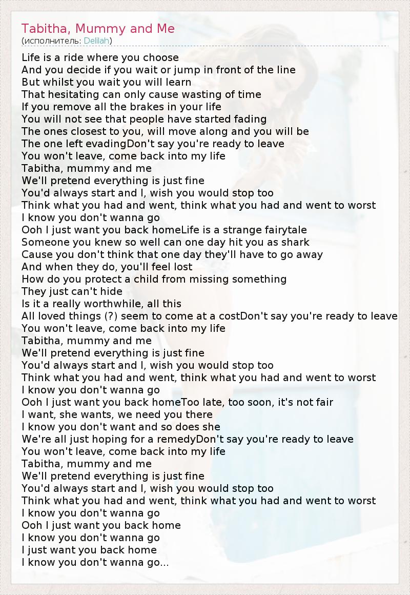 Life is a ride where you choose And you decide if you wait or jump in front of the line But whilst you wait you will learn That hesitating can only cause wasting of time If you remove all the brakes in your life You will not see that people have started fading The ones closest to you, will move along and you will be The one left evadingDon't say you're ready to leave You won't leave, come back into my life Tabitha, mummy and me We'll pretend everything is just fine You'd always start and I, wish you would stop too Think what you had and went, think what you had and went to worst I know you don't wanna go Ooh I just want you back homeLife is a strange fairytale Someone you knew so well can one day hit you as shark Cause you don't think that one day they'll have to go away And when they do, you'll feel lost How do you protect a child from missing something They just can't hide Is it a really worthwhile, all this All loved things (?) seem to come at a costDon't say you're ready to leave You won't leave, come back into my life Tabitha, mummy and me We'll pretend everything is just fine You'd always start and I, wish you would stop too Think what you had and went, think what you had and went to worst I know you don't wanna go Ooh I just want you back homeToo late, too soon, it's not fair I want, she wants, we need you there I know you don't want and so does she We're all just hoping for a remedyDon't say you're ready to leave You won't leave, come back into my life Tabitha, mummy and me We'll pretend everything is just fine You'd always start and I, wish you would stop too Think what you had and went, think what you had and went to worst I know you don't wanna go Ooh I just want you back home I know you don't wanna go I just want you back home I know you don't wanna go...