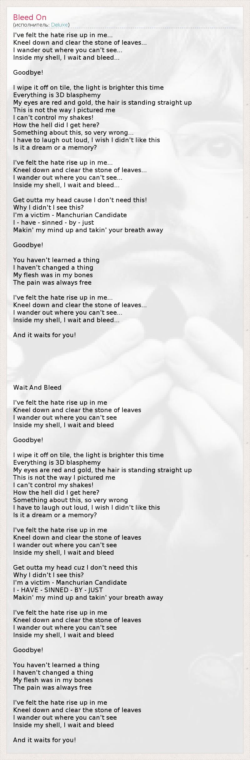 I've felt the hate rise up in me... Kneel down and clear the stone of leaves... I wander out where you can't see... Inside my shell, I wait and bleed... Goodbye! I wipe it off on tile, the light is brighter this time Everything is 3D blasphemy My eyes are red and gold, the hair is standing straight up This is not the way I pictured me I can't control my shakes! How the hell did I get here? Something about this, so very wrong... I have to laugh out loud, I wish I didn't like this Is it a dream or a memory? I've felt the hate rise up in me... Kneel down and clear the stone of leaves... I wander out where you can't see... Inside my shell, I wait and bleed... Get outta my head cause I don't need this! Why I didn't I see this? I'm a victim - Manchurian Candidate I - have - sinned - by - just Makin' my mind up and takin' your breath away Goodbye! You haven't learned a thing I haven't changed a thing My flesh was in my bones The pain was always free I've felt the hate rise up in me... Kneel down and clear the stone of leaves... I wander out where you can't see... Inside my shell, I wait and bleed... And it waits for you! Wait And Bleed I've felt the hate rise up in me Kneel down and clear the stone of leaves I wander out where you can't see Inside my shell, I wait and bleed Goodbye! I wipe it off on tile, the light is brighter this time Everything is 3D blasphemy My eyes are red and gold, the hair is standing straight up This is not the way I pictured me I can't control my shakes! How the hell did I get here? Something about this, so very wrong I have to laugh out loud, I wish I didn't like this Is it a dream or a memory? I've felt the hate rise up in me Kneel down and clear the stone of leaves I wander out where you can't see Inside my shell, I wait and bleed Get outta my head cuz I don't need this Why I didn't I see this? I'm a victim - Manchurian Candidate I - HAVE - SINNED - BY - JUST Makin' my mind up and takin' your breath away I've felt the hate rise up in me Kneel down and clear the stone of leaves I wander out where you can't see Inside my shell, I wait and bleed Goodbye! You haven't learned a thing I haven't changed a thing My flesh was in my bones The pain was always free I've felt the hate rise up in me Kneel down and clear the stone of leaves I wander out where you can't see Inside my shell, I wait and bleed And it waits for you!