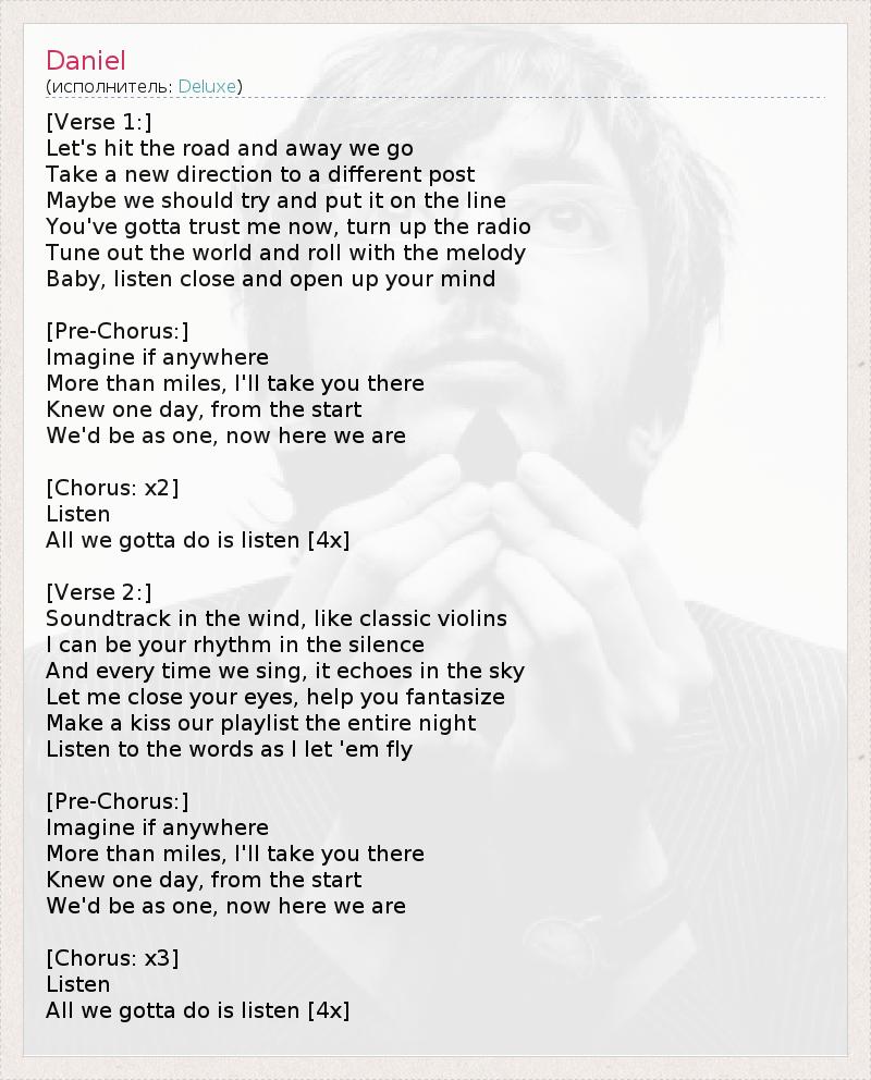 [1 куплет:] Итак, в дорогу! Уедем отсюда В новом направлении в новое место. Может, нам стоит рискнуть и поставить на кон всё. Ты должна мне доверять. Включи радио погромче, Заглуши мир, и пусть музыка сопровождает тебя в пути. Крошка, слушай внимательно и раскрой свою душу. [Распевка:] Представь, что есть такое место, Где ширь – без края. Я возьму тебя туда. Я знал с самого начала, что однажды Мы станем одним целым. Так и случилось. [Припев: x2] Слушать, Всё, что нам нужно делать, – это слушать. [4x] [2 куплет:] Ветер звучит саундтреком, словно скрипки. Я могу быть твоим ритмом в тишине, И стоит мне запеть, как голос отдается эхом в небесах. Дай мне закрыть твои глаза и разбудить твою фантазию. Целуй наш плейлист всю ночь напролёт, Слушай слова, слетающие с моих уст. [Распевка:] Представь, что есть такое место, Где ширь – без края. Я возьму тебя туда. Я знал с самого начала, что однажды Мы станем одним целым. Так и случилось. [Припев: x3] Слушать, Всё, что нам нужно делать, – это слушать. [4x]