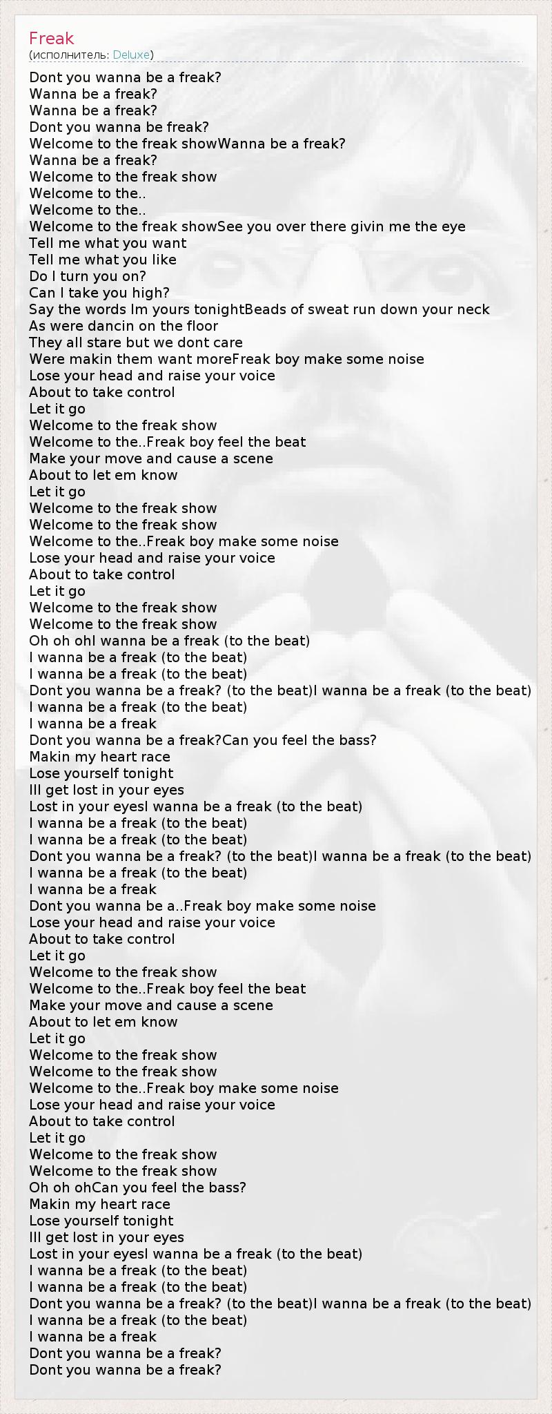 Dont you wanna be a freak? Wanna be a freak? Wanna be a freak? Dont you wanna be freak? Welcome to the freak showWanna be a freak? Wanna be a freak? Welcome to the freak show Welcome to the.. Welcome to the.. Welcome to the freak showSee you over there givin me the eye Tell me what you want Tell me what you like Do I turn you on? Can I take you high? Say the words Im yours tonightBeads of sweat run down your neck As were dancin on the floor They all stare but we dont care Were makin them want moreFreak boy make some noise Lose your head and raise your voice About to take control Let it go Welcome to the freak show Welcome to the..Freak boy feel the beat Make your move and cause a scene About to let em know Let it go Welcome to the freak show Welcome to the freak show Welcome to the..Freak boy make some noise Lose your head and raise your voice About to take control Let it go Welcome to the freak show Welcome to the freak show Oh oh ohI wanna be a freak (to the beat) I wanna be a freak (to the beat) I wanna be a freak (to the beat) Dont you wanna be a freak? (to the beat)I wanna be a freak (to the beat) I wanna be a freak (to the beat) I wanna be a freak Dont you wanna be a freak?Can you feel the bass? Makin my heart race Lose yourself tonight Ill get lost in your eyes Lost in your eyesI wanna be a freak (to the beat) I wanna be a freak (to the beat) I wanna be a freak (to the beat) Dont you wanna be a freak? (to the beat)I wanna be a freak (to the beat) I wanna be a freak (to the beat) I wanna be a freak Dont you wanna be a..Freak boy make some noise Lose your head and raise your voice About to take control Let it go Welcome to the freak show Welcome to the..Freak boy feel the beat Make your move and cause a scene About to let em know Let it go Welcome to the freak show Welcome to the freak show Welcome to the..Freak boy make some noise Lose your head and raise your voice About to take control Let it go Welcome to the freak show Welcome to the freak show Oh oh ohCan you feel the bass? Makin my heart race Lose yourself tonight Ill get lost in your eyes Lost in your eyesI wanna be a freak (to the beat) I wanna be a freak (to the beat) I wanna be a freak (to the beat) Dont you wanna be a freak? (to the beat)I wanna be a freak (to the beat) I wanna be a freak (to the beat) I wanna be a freak Dont you wanna be a freak? Dont you wanna be a freak?