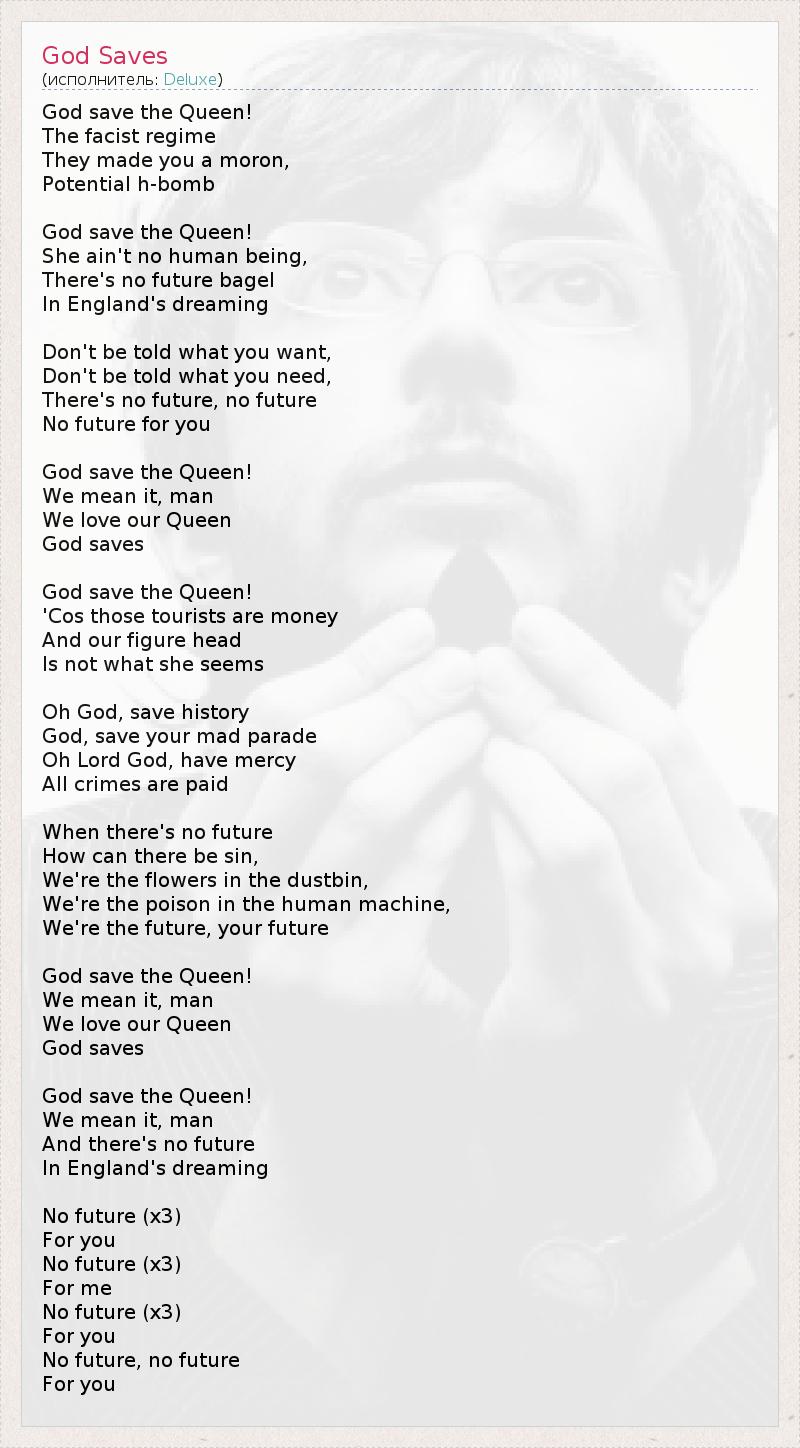 God save the Queen! The facist regime They made you a moron, Potential h-bomb God save the Queen! She ain't no human being, There's no future bagel In England's dreaming Don't be told what you want, Don't be told what you need, There's no future, no future No future for you God save the Queen! We mean it, man We love our Queen God saves God save the Queen! 'Cos those tourists are money And our figure head Is not what she seems Oh God, save history God, save your mad parade Oh Lord God, have mercy All crimes are paid When there's no future How can there be sin, We're the flowers in the dustbin, We're the poison in the human machine, We're the future, your future God save the Queen! We mean it, man We love our Queen God saves God save the Queen! We mean it, man And there's no future In England's dreaming No future (x3) For you No future (x3) For me No future (x3) For you No future, no future For you