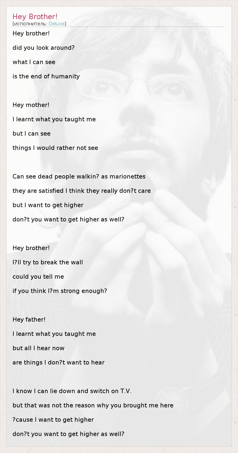 Hey brother! did you look around? what I can see is the end of humanity Hey mother! I learnt what you taught me but I can see things I would rather not see Can see dead people walkin? as marionettes they are satisfied I think they really don?t care but I want to get higher don?t you want to get higher as well? Hey brother! I?ll try to break the wall could you tell me if you think I?m strong enough? Hey father! I learnt what you taught me but all I hear now are things I don?t want to hear I know I can lie down and switch on T.V. but that was not the reason why you brought me here ?cause I want to get higher don?t you want to get higher as well?