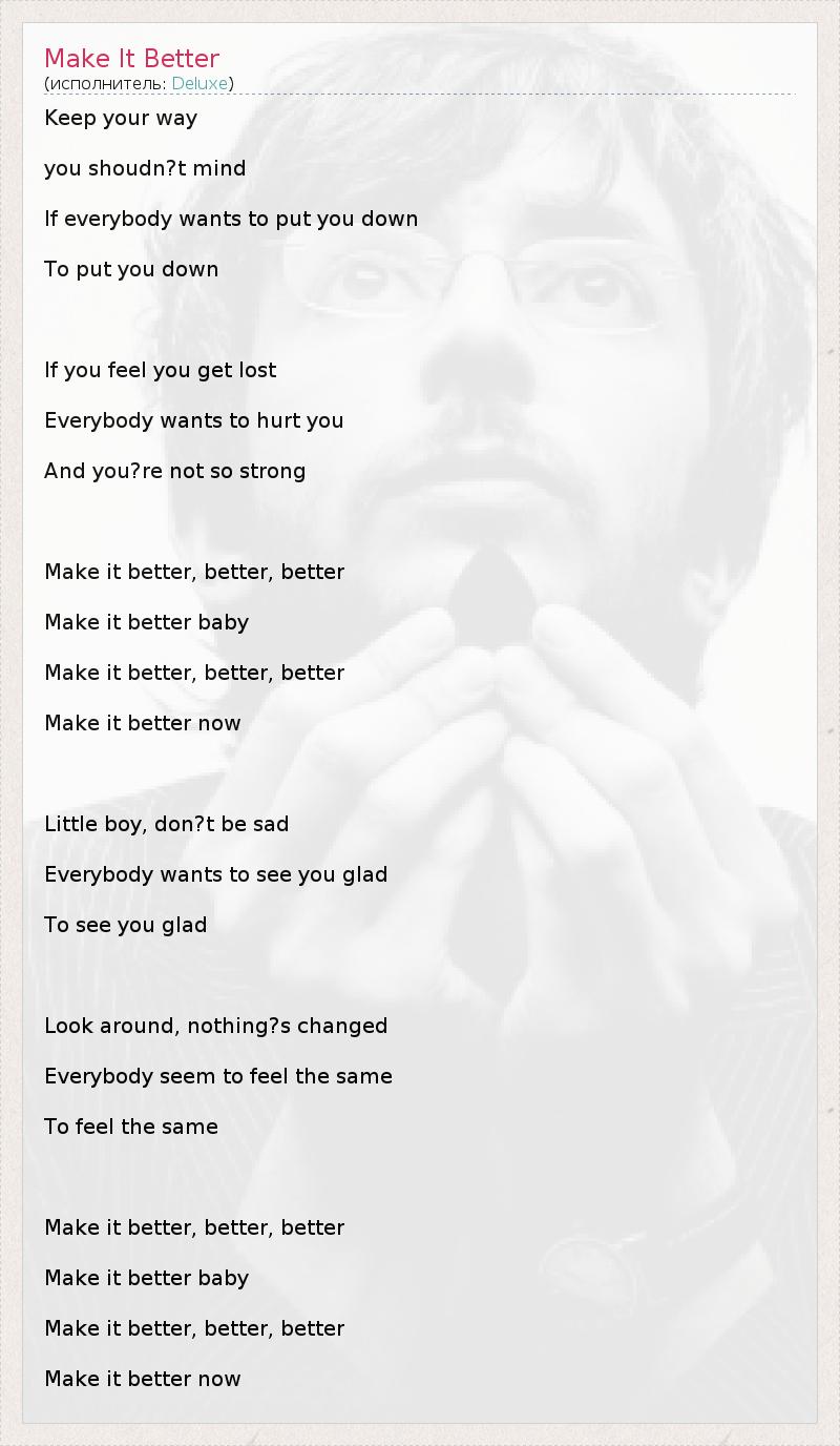 Keep your way you shoudn?t mind If everybody wants to put you down To put you down If you feel you get lost Everybody wants to hurt you And you?re not so strong Make it better, better, better Make it better baby Make it better, better, better Make it better now Little boy, don?t be sad Everybody wants to see you glad To see you glad Look around, nothing?s changed Everybody seem to feel the same To feel the same Make it better, better, better Make it better baby Make it better, better, better Make it better now