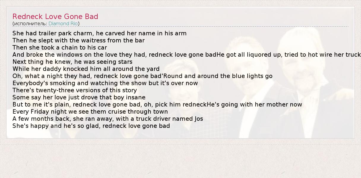 А как ты думаешь, о чем песня "Redneck Love Gone Bad" ?