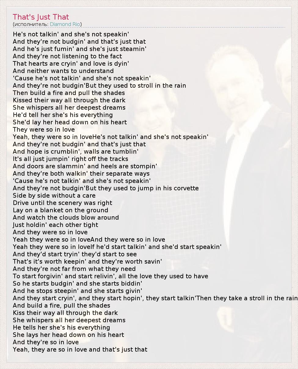 He's not talkin' and she's not speakin' And they're not budgin' and that's just that And he's just fumin' and she's just steamin' And they're not listening to the fact That hearts are cryin' and love is dyin' And neither wants to understand 'Cause he's not talkin' and she's not speakin' And they're not budgin'But they used to stroll in the rain Then build a fire and pull the shades Kissed their way all through the dark She whispers all her deepest dreams He'd tell her she's his everything She'd lay her head down on his heart They were so in love Yeah, they were so in loveHe's not talkin' and she's not speakin' And they're not budgin' and that's just that And hope is crumblin', walls are tumblin' It's all just jumpin' right off the tracks And doors are slammin' and heels are stompin' And they're both walkin' their separate ways 'Cause he's not talkin' and she's not speakin' And they're not budgin'But they used to jump in his corvette Side by side without a care Drive until the scenery was right Lay on a blanket on the ground And watch the clouds blow around Just holdin' each other tight And they were so in love Yeah they were so in loveAnd they were so in love Yeah they were so in loveIf he'd start talkin' and she'd start speakin' And they'd start tryin' they'd start to see That's it's worth keepin' and they're worth savin' And they're not far from what they need To start forgivin' and start relivin', all the love they used to have So he starts budgin' and she starts biddin' And he stops steepin' and she starts givin' And they start cryin', and they start hopin', they start talkin'Then they take a stroll in the rain And build a fire, pull the shades Kiss their way all through the dark She whispers all her deepest dreams He tells her she's his everything She lays her head down on his heart And they're so in love Yeah, they are so in love and that's just that
