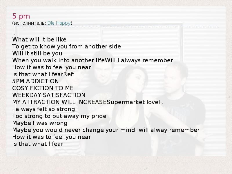 I. What will it be like To get to know you from another side Will it still be you When you walk into another lifeWill I always remember How it was to feel you near Is that what I fearRef: 5PM ADDICTION COSY FICTION TO ME WEEKDAY SATISFACTION MY ATTRACTION WILL INCREASESupermarket loveII. I always felt so strong Too strong to put away my pride Maybe I was wrong Maybe you would never change your mindI will alway remember How it was to feel you near Is that what I fear