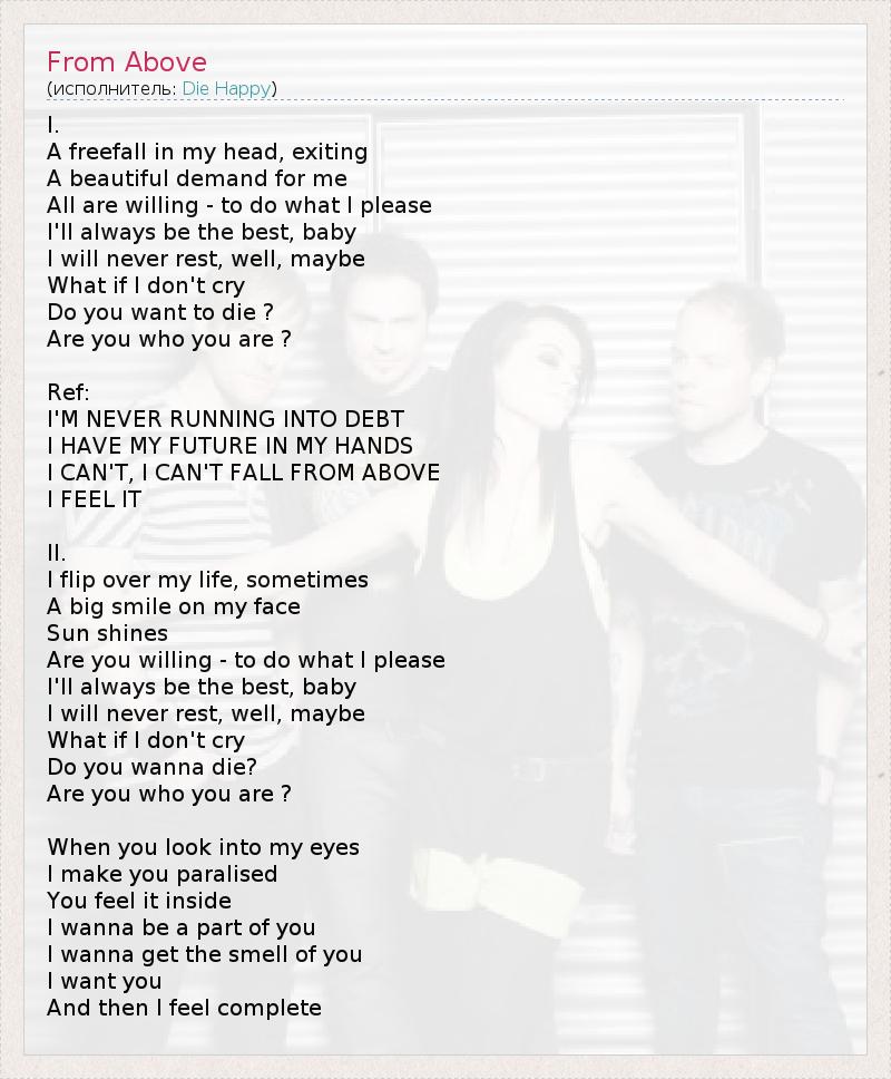 Это интересно:Die Happy - это немецкая группа из города Ульма (Ulm). Название группы (дословно "Умри Счастливым") на английском экстрим-сленге означает (одновременный летальный) перелом шеи и ноги. Критики отмечают их музыкальный стиль как Popcore: смесь rock и pop.Группа основана в 1993 году чешской певицей Мартой Яндовой (Marta Jandová) и Торстеном Мевесом (Thorsten Mewes), получившими в этом году аттестат зрелости.Die... продолжение