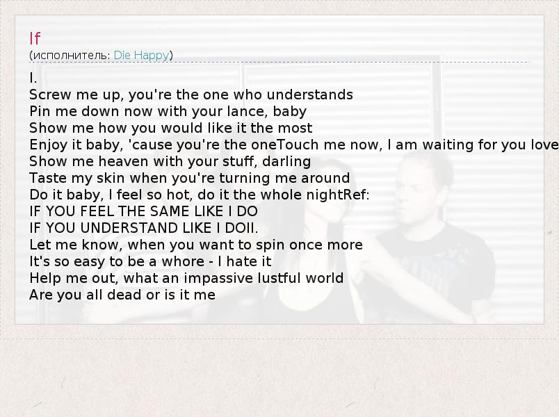 Это интересно:Die Happy - это немецкая группа из города Ульма (Ulm). Название группы (дословно "Умри Счастливым") на английском экстрим-сленге означает (одновременный летальный) перелом шеи и ноги. Критики отмечают их музыкальный стиль как Popcore: смесь rock и pop.Группа основана в 1993 году чешской певицей Мартой Яндовой (Marta Jandová) и Торстеном Мевесом (Thorsten Mewes), получившими в этом году аттестат зрелости.Die... продолжение