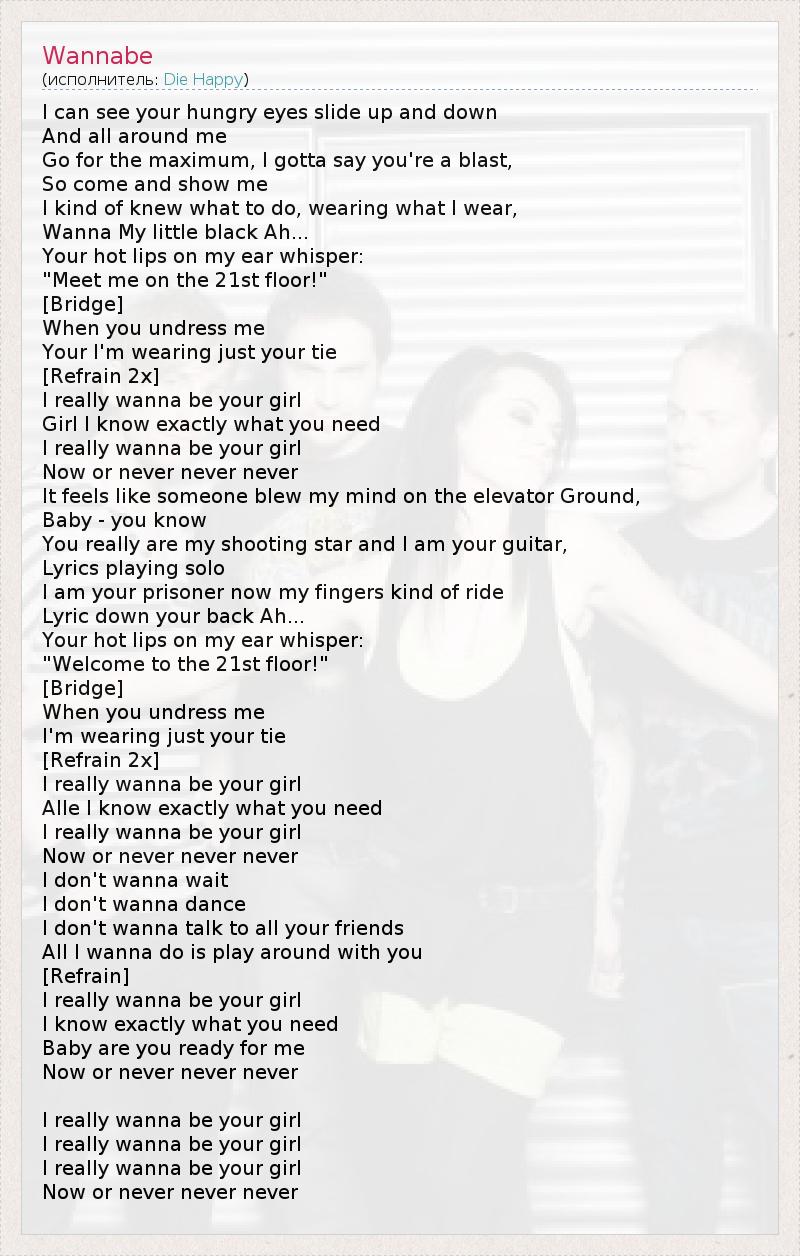 I can see your hungry eyes slide up and down And all around me Go for the maximum, I gotta say you're a blast, So come and show me I kind of knew what to do, wearing what I wear, Wanna My little black Ah... Your hot lips on my ear whisper: "Meet me on the 21st floor!" [Bridge] When you undress me Your I'm wearing just your tie [Refrain 2x] I really wanna be your girl Girl I know exactly what you need I really wanna be your girl Now or never never never It feels like someone blew my mind on the elevator Ground, Baby - you know You really are my shooting star and I am your guitar, Lyrics playing solo I am your prisoner now my fingers kind of ride Lyric down your back Ah... Your hot lips on my ear whisper: "Welcome to the 21st floor!" [Bridge] When you undress me I'm wearing just your tie [Refrain 2x] I really wanna be your girl Alle I know exactly what you need I really wanna be your girl Now or never never never I don't wanna wait I don't wanna dance I don't wanna talk to all your friends All I wanna do is play around with you [Refrain] I really wanna be your girl I know exactly what you need Baby are you ready for me Now or never never never I really wanna be your girl I really wanna be your girl I really wanna be your girl Now or never never never