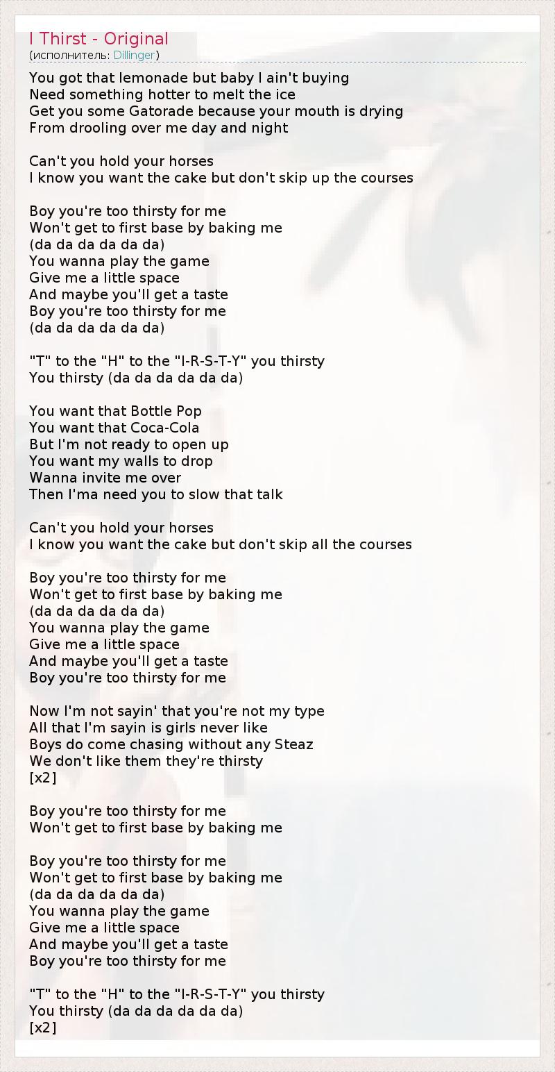 У тебя есть лимонад, но я не куплюсь, милый, Чтобы растопить мой лед, нужно что-нибудь погорячее, Купи себе Gatorade, 1 если во рту пересохло От того, что ты днем и ночью исходишь по мне слюной... Не мог бы ты попридержать коней? Я знаю, что ты хочешь десерта, но не пропускай основных блюд Парень, для меня ты слишком томишься от жажды, Тебе не пробиться к первой базе, допекая меня (да да да да да да) Если хочешь поиграть, Дай и мне немного места, Быть может, тогда и попробуешь, Парень, для меня ты слишком томишься от жажды... (да да да да да да) "Ж" и "А" и "Ж-Д-Е-Ш-Ь", ты жаждешь, Ты жаждешь (да да да да да да) Хочешь этой газировки, Хочешь этой Кока-Колы, Но я не готова ее открыть, Ты хочешь, чтобы мои стены пали, Хочешь пригласить к себе, Тогда тебе стоит с этим помедлить... Не мог бы ты попридержать коней? Я знаю, что ты хочешь десерта, но не пропускай основных блюд Парень, для меня ты слишком томишься от жажды, Тебе не пробиться к первой базе, допекая меня (да да да да да да) Если хочешь поиграть, Дай и мне немного места, Быть может, тогда и попробуешь, Парень, для меня ты слишком томишься от жажды... Я ведь не говорю, что ты не мой тип, Я говорю лишь о том, чем девушек не завоевать, Парни бегают за нами, не прихватив даже Steaz, 2 А жаждущие нам не по вкусу. [x2] Парень, для меня ты слишком томишься от жажды, Тебе не пробиться к первой базе, допекая меня... Парень, для меня ты слишком томишься от жажды, Тебе не пробиться к первой базе, допекая меня (да да да да да да) Если хочешь поиграть, Дай и мне немного места, Быть может, тогда и попробуешь, Парень, для меня ты слишком томишься от жажды... "Ж" и "А" и "Ж-Д-Е-Ш-Ь", ты жаждешь, Ты жаждешь (да да да да да да) [x2] 1 - Спортивный напиток, употребляемый для восстановления водно-солевого баланса после сильной нагрузки. 2 - Бренд напитков на основе зеленого чая.