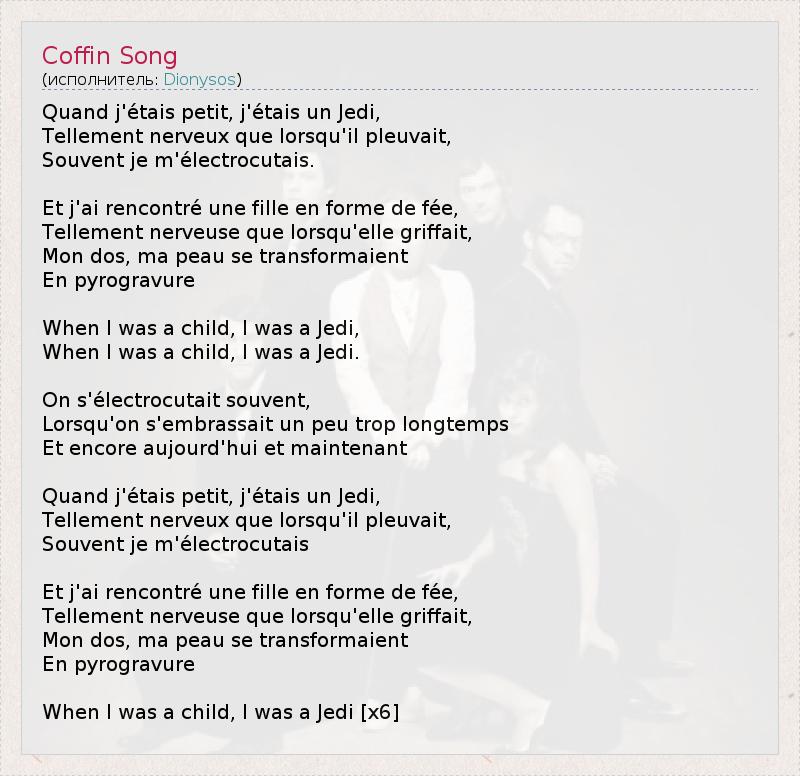 Quand j'étais petit, j'étais un Jedi, Tellement nerveux que lorsqu'il pleuvait, Souvent je m'électrocutais. Et j'ai rencontré une fille en forme de fée, Tellement nerveuse que lorsqu'elle griffait, Mon dos, ma peau se transformaient En pyrogravure When I was a child, I was a Jedi, When I was a child, I was a Jedi. On s'électrocutait souvent, Lorsqu'on s'embrassait un peu trop longtemps Et encore aujourd'hui et maintenant Quand j'étais petit, j'étais un Jedi, Tellement nerveux que lorsqu'il pleuvait, Souvent je m'électrocutais Et j'ai rencontré une fille en forme de fée, Tellement nerveuse que lorsqu'elle griffait, Mon dos, ma peau se transformaient En pyrogravure When I was a child, I was a Jedi [x6]