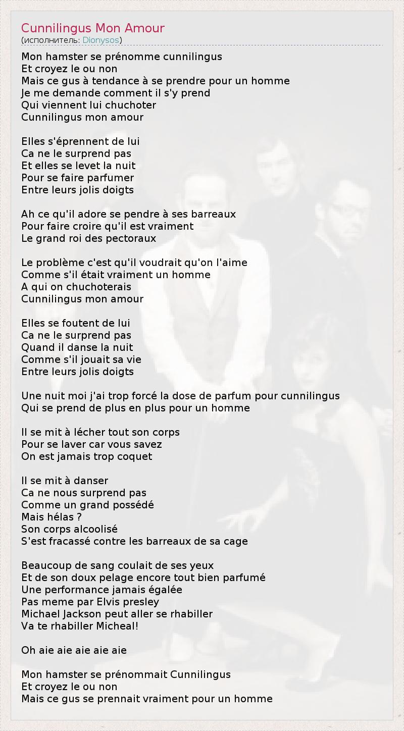 Mon hamster se prénomme cunnilingus Et croyez le ou non Mais ce gus à tendance à se prendre pour un homme Je me demande comment il s'y prend Qui viennent lui chuchoter Cunnilingus mon amour Elles s'éprennent de lui Ca ne le surprend pas Et elles se levet la nuit Pour se faire parfumer Entre leurs jolis doigts Ah ce qu'il adore se pendre à ses barreaux Pour faire croire qu'il est vraiment Le grand roi des pectoraux Le problème c'est qu'il voudrait qu'on l'aime Comme s'il était vraiment un homme A qui on chuchoterais Cunnilingus mon amour Elles se foutent de lui Ca ne le surprend pas Quand il danse la nuit Comme s'il jouait sa vie Entre leurs jolis doigts Une nuit moi j'ai trop forcé la dose de parfum pour cunnilingus Qui se prend de plus en plus pour un homme Il se mit à lécher tout son corps Pour se laver car vous savez On est jamais trop coquet Il se mit à danser Ca ne nous surprend pas Comme un grand possédé Mais hélas ? Son corps alcoolisé S'est fracassé contre les barreaux de sa cage Beaucoup de sang coulait de ses yeux Et de son doux pelage encore tout bien parfumé Une performance jamais égalée Pas meme par Elvis presley Michael Jackson peut aller se rhabiller Va te rhabiller Micheal! Oh aie aie aie aie aie Mon hamster se prénommait Cunnilingus Et croyez le ou non Mais ce gus se prennait vraiment pour un homme