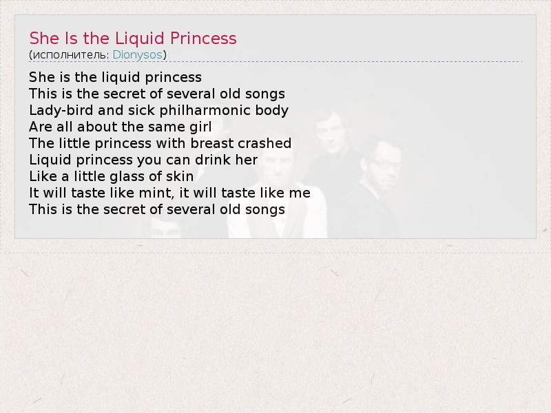 А как ты думаешь, о чем песня "She Is the Liquid Princess" ?