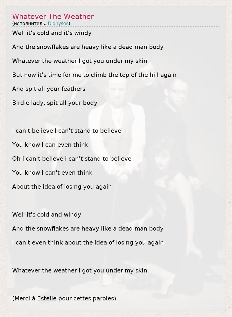 Well it's cold and it's windy And the snowflakes are heavy like a dead man body Whatever the weather I got you under my skin But now it's time for me to climb the top of the hill again And spit all your feathers Birdie lady, spit all your body I can't believe I can't stand to believe You know I can even think Oh I can't believe I can't stand to believe You know I can't even think About the idea of losing you again Well it's cold and windy And the snowflakes are heavy like a dead man body I can't even think about the idea of losing you again Whatever the weather I got you under my skin (Merci à Estelle pour cettes paroles)