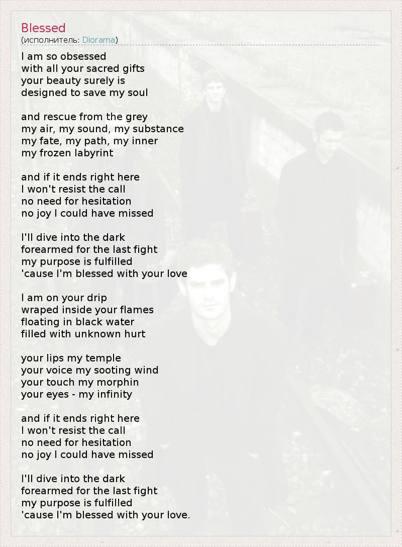 I am so obsessed with all your sacred gifts your beauty surely is designed to save my soul and rescue from the grey my air, my sound, my substance my fate, my path, my inner my frozen labyrint and if it ends right here I won't resist the call no need for hesitation no joy I could have missed I'll dive into the dark forearmed for the last fight my purpose is fulfilled 'cause I'm blessed with your love I am on your drip wraped inside your flames floating in black water filled with unknown hurt your lips my temple your voice my sooting wind your touch my morphin your eyes - my infinity and if it ends right here I won't resist the call no need for hesitation no joy I could have missed I'll dive into the dark forearmed for the last fight my purpose is fulfilled 'cause I'm blessed with your love.
