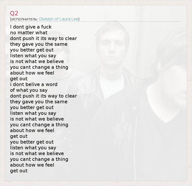 I dont give a fuck no matter what dont push it its way to clear they gave you the same you better get out listen what you say is not what we believe you cant change a thing about how we feel get out i dont belive a word of what you say dont push it its way to clear they gave you the same you better get out listen what you say is not what we believe you cant change a thing about how we feel get out you better get out listen what you say is not what we believe you cant change a thing about how we feel get out