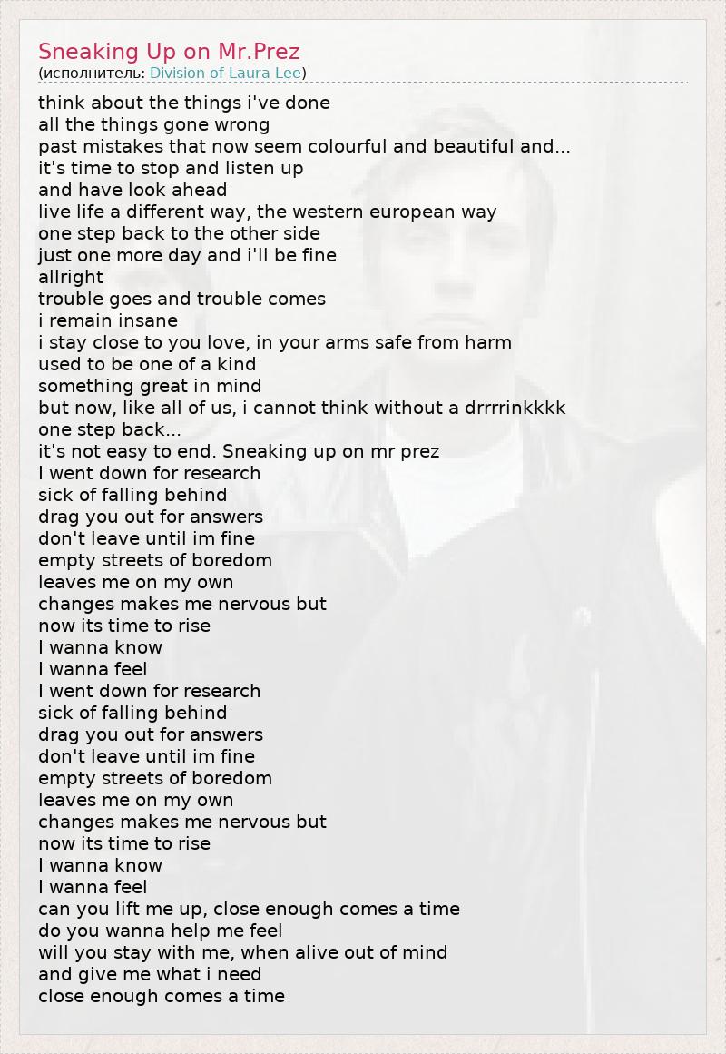 think about the things i've done all the things gone wrong past mistakes that now seem colourful and beautiful and... it's time to stop and listen up and have look ahead live life a different way, the western european way one step back to the other side just one more day and i'll be fine allright trouble goes and trouble comes i remain insane i stay close to you love, in your arms safe from harm used to be one of a kind something great in mind but now, like all of us, i cannot think without a drrrrinkkkk one step back... it's not easy to end. Sneaking up on mr prez I went down for research sick of falling behind drag you out for answers don't leave until im fine empty streets of boredom leaves me on my own changes makes me nervous but now its time to rise I wanna know I wanna feel I went down for research sick of falling behind drag you out for answers don't leave until im fine empty streets of boredom leaves me on my own changes makes me nervous but now its time to rise I wanna know I wanna feel can you lift me up, close enough comes a time do you wanna help me feel will you stay with me, when alive out of mind and give me what i need close enough comes a time