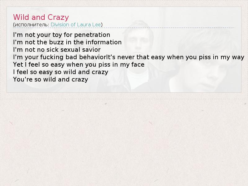 I'm not your toy for penetration I'm not the buzz in the information I'm not no sick sexual savior I'm your fucking bad behaviorIt's never that easy when you piss in my way Yet I feel so easy when you piss in my face I feel so easy so wild and crazy You're so wild and crazy