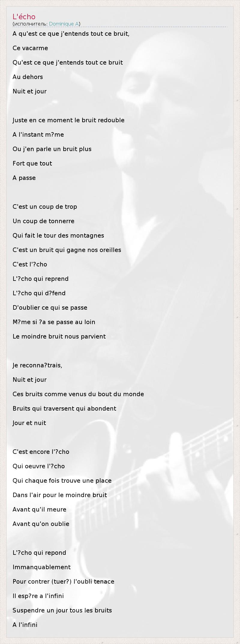 A qu'est ce que j'entends tout ce bruit, Ce vacarme Qu'est ce que j'entends tout ce bruit Au dehors Nuit et jour Juste en ce moment le bruit redouble A l'instant m?me Ou j'en parle un bruit plus Fort que tout A passe C'est un coup de trop Un coup de tonnerre Qui fait le tour des montagnes C'est un bruit qui gagne nos oreilles C'est l'?cho L'?cho qui reprend L'?cho qui d?fend D'oublier ce qui se passe M?me si ?a se passe au loin Le moindre bruit nous parvient Je reconna?trais, Nuit et jour Ces bruits comme venus du bout du monde Bruits qui traversent qui abondent Jour et nuit C'est encore l'?cho Qui oeuvre l'?cho Qui chaque fois trouve une place Dans l'air pour le moindre bruit Avant qu'il meure Avant qu'on oublie L'?cho qui repond Immanquablement Pour contrer (tuer?) l'oubli tenace Il esp?re a l'infini Suspendre un jour tous les bruits A l'infini