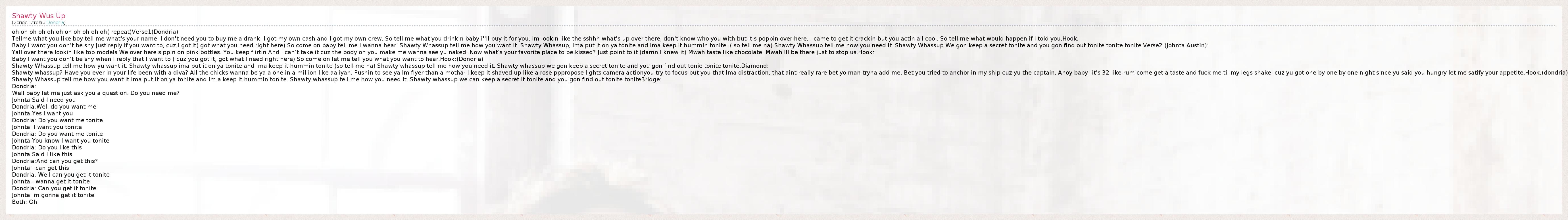oh oh oh oh oh oh oh oh oh oh oh( repeat)Verse1(Dondria) Tellme what you like boy tell me what's your name. I don't need you to buy me a drank. I got my own cash and I got my own crew. So tell me what you drinkin baby i''ll buy it for you. Im lookin like the sshhh what's up over there, don't know who you with but it's poppin over here. I came to get it crackin but you actin all cool. So tell me what would happen if I told you.Hook: Baby I want you don't be shy just reply if you want to, cuz I got it( got what you need right here) So come on baby tell me I wanna hear. Shawty Whassup tell me how you want it. Shawty Whassup, Ima put it on ya tonite and Ima keep it hummin tonite. ( so tell me na) Shawty Whassup tell me how you need it. Shawty Whassup We gon keep a secret tonite and you gon find out tonite tonite tonite.Verse2 (Johnta Austin): Yall over there lookin like top models We over here sippin on pink bottles. You keep flirtin And I can't take it cuz the body on you make me wanna see yu naked. Now what's your favorite place to be kissed? Just point to it (damn I knew it) Mwah taste like chocolate. Mwah Ill be there just to stop us.Hook: Baby I want you don't be shy when I reply that I want to ( cuz you got it, got what I need right here) So come on let me tell you what you want to hear.Hook:(Dondria) Shawty Whassup tell me how yu want it. Shawty whassup ima put it on ya tonite and ima keep it hummin tonite (so tell me na) Shawty whassup tell me how you need it. Shawty whassup we gon keep a secret tonite and you gon find out tonie tonite tonite.Diamond: Shawty whassup? Have you ever in your life been with a diva? All the chicks wanna be ya a one in a million like aaliyah. Pushin to see ya Im flyer than a motha- I keep it shaved up like a rose pppropose lights camera actionyou try to focus but you that Ima distraction. that aint really rare bet yo man tryna add me. Bet you tried to anchor in my ship cuz yu the captain. Ahoy baby! it's 32 like rum come get a taste and fuck me til my legs shake. cuz yu got one by one by one night since yu said you hungry let me satify your appetite.Hook:(dondria) Shawty Whassup tell me how you want it Ima put it on ya tonite and im a keep it hummin tonite. Shawty whassup tell me how you need it. Shawty whassup we can keep a secret it tonite and you gon find out tonite toniteBridge: Dondria: Well baby let me just ask you a question. Do you need me? Johnta:Said I need you Dondria:Well do you want me Johnta:Yes I want you Dondria: Do you want me tonite Johnta: I want you tonite Dondria: Do you want me tonite Johnta:You know I want you tonite Dondria: Do you like this Johnta:Said I like this Dondria:And can you get this? Johnta:I can get this Dondria: Well can you get it tonite Johnta:I wanna get it tonite Dondria: Can you get it tonite Johnta:Im gonna get it tonite Both: Oh