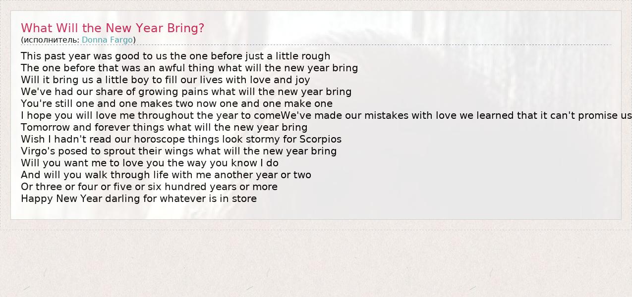 ГлавнаяИсполнителиDonna FargoWhat Will the New Year Bring?