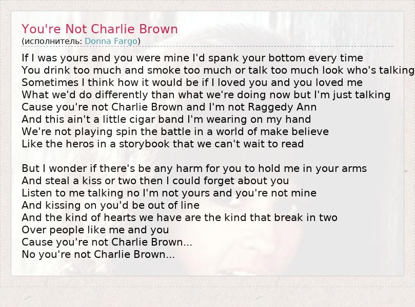 If I was yours and you were mine I'd spank your bottom every time You drink too much and smoke too much or talk too much look who's talking Sometimes I think how it would be if I loved you and you loved me What we'd do differently than what we're doing now but I'm just talking Cause you're not Charlie Brown and I'm not Raggedy Ann And this ain't a little cigar band I'm wearing on my hand We're not playing spin the battle in a world of make believe Like the heros in a storybook that we can't wait to read But I wonder if there's be any harm for you to hold me in your arms And steal a kiss or two then I could forget about you Listen to me talking no I'm not yours and you're not mine And kissing on you'd be out of line And the kind of hearts we have are the kind that break in two Over people like me and you Cause you're not Charlie Brown... No you're not Charlie Brown...