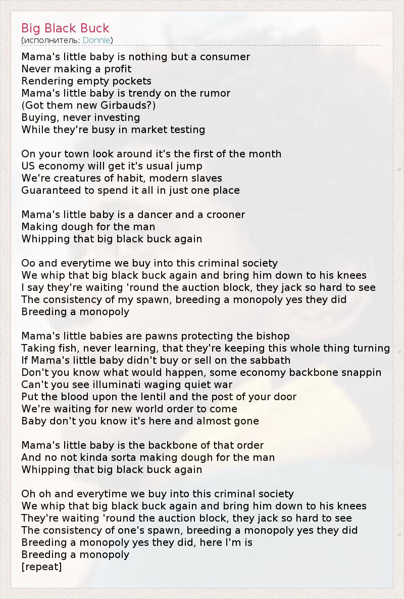 Mama's little baby is nothing but a consumer Never making a profit Rendering empty pockets Mama's little baby is trendy on the rumor (Got them new Girbauds?) Buying, never investing While they're busy in market testing On your town look around it's the first of the month US economy will get it's usual jump We're creatures of habit, modern slaves Guaranteed to spend it all in just one place Mama's little baby is a dancer and a crooner Making dough for the man Whipping that big black buck again Oo and everytime we buy into this criminal society We whip that big black buck again and bring him down to his knees I say they're waiting 'round the auction block, they jack so hard to see The consistency of my spawn, breeding a monopoly yes they did Breeding a monopoly Mama's little babies are pawns protecting the bishop Taking fish, never learning, that they're keeping this whole thing turning If Mama's little baby didn't buy or sell on the sabbath Don't you know what would happen, some economy backbone snappin Can't you see illuminati waging quiet war Put the blood upon the lentil and the post of your door We're waiting for new world order to come Baby don't you know it's here and almost gone Mama's little baby is the backbone of that order And no not kinda sorta making dough for the man Whipping that big black buck again Oh oh and everytime we buy into this criminal society We whip that big black buck again and bring him down to his knees They're waiting 'round the auction block, they jack so hard to see The consistency of one's spawn, breeding a monopoly yes they did Breeding a monopoly yes they did, here I'm is Breeding a monopoly [repeat]