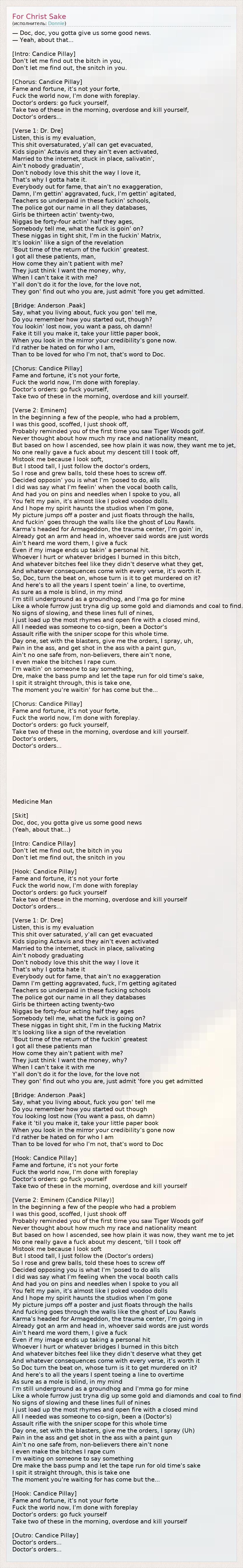 — Doc, doc, you gotta give us some good news. — Yeah, about that... [Intro: Candice Pillay] Don't let me find out the bitch in you, Don't let me find out, the snitch in you. [Chorus: Candice Pillay] Fame and fortune, it's not your forte, Fuck the world now, I'm done with foreplay. Doctor's orders: go fuck yourself, Take two of these in the morning, overdose and kill yourself, Doctor's orders... [Verse 1: Dr. Dre] Listen, this is my evaluation, This shit oversaturated, y'all can get evacuated, Kids sippin' Actavis and they ain't even activated, Married to the internet, stuck in place, salivatin', Ain't nobody graduatin', Don't nobody love this shit the way I love it, That's why I gotta hate it. Everybody out for fame, that ain't no exaggeration, Damn, I'm gettin' aggravated, fuck, I'm gettin' agitated, Teachers so underpaid in these fuckin' schools, The police got our name in all they databases, Girls be thirteen actin' twenty-two, Niggas be forty-four actin' half they ages, Somebody tell me, what the fuck is goin' on? These niggas in tight shit, I'm in the fuckin' Matrix, It's lookin' like a sign of the revelation 'Bout time of the return of the fuckin' greatest. I got all these patients, man, How come they ain't patient with me? They just think I want the money, why, When I can't take it with me? Y'all don't do it for the love, for the love not, They gon' find out who you are, just admit 'fore you get admitted. [Bridge: Anderson .Paak] Say, what you living about, fuck you gon' tell me, Do you remember how you started out, though? You lookin' lost now, you want a pass, oh damn! Fake it till you make it, take your little paper book, When you look in the mirror your credibility's gone now. I'd rather be hated on for who I am, Than to be loved for who I'm not, that's word to Doc. [Chorus: Candice Pillay] Fame and fortune, it's not your forte, Fuck the world now, I'm done with foreplay. Doctor's orders: go fuck yourself, Take two of these in the morning, overdose and kill yourself. [Verse 2: Eminem] In the beginning a few of the people, who had a problem, I was this good, scoffed, I just shook off, Probably reminded you of the first time you saw Tiger Woods golf. Never thought about how much my race and nationality meant, But based on how I ascended, see how plain it was now, they want me to jet, No one really gave a fuck about my descent till I took off, Mistook me because I look soft, But I stood tall, I just follow the doctor's orders, So I rose and grew balls, told these hoes to screw off. Decided opposin' you is what I'm ‘posed to do, alls I did was say what I'm feelin' when the vocal booth calls, And had you on pins and needles when I spoke to you, all You felt my pain, it's almost like I poked voodoo dolls. And I hope my spirit haunts the studios when I'm gone, My picture jumps off a poster and just floats through the halls, And fuckin' goes through the walls like the ghost of Lou Rawls. Karma's headed for Armageddon, the trauma center, I'm goin' in, Already got an arm and head in, whoever said words are just words Ain't heard me word them, I give a fuck Even if my image ends up takin' a personal hit. Whoever I hurt or whatever bridges I burned in this bitch, And whatever bitches feel like they didn't deserve what they get, And whatever consequences come with every verse, it's worth it. So, Doc, turn the beat on, whose turn is it to get murdered on it? And here's to all the years I spent toein' a line, to overtime, As sure as a mole is blind, in my mind I'm still underground as a groundhog, and I'ma go for mine Like a whole furrow just tryna dig up some gold and diamonds and coal to find. No signs of slowing, and these lines full of nines, I just load up the most rhymes and open fire with a closed mind, All I needed was someone to co-sign, been a Doctor's Assault rifle with the sniper scope for this whole time. Day one, set with the blasters, give me the orders, I spray, uh, Pain in the ass, and get shot in the ass with a paint gun, Ain't no one safe from, non-believers, there ain't none, I even make the bitches I rape cum. I'm waitin' on someone to say something, Dre, make the bass pump and let the tape run for old time's sake, I spit it straight through, this is take one, The moment you're waitin' for has come but the... [Chorus: Candice Pillay] Fame and fortune, it's not your forte, Fuck the world now, I'm done with foreplay. Doctor's orders: go fuck yourself, Take two of these in the morning, overdose and kill yourself. Doctor's orders, Doctor's orders... Medicine Man [Skit] Doc, doc, you gotta give us some good news (Yeah, about that...) [Intro: Candice Pillay] Don't let me find out, the bitch in you Don't let me find out, the snitch in you [Hook: Candice Pillay] Fame and fortune, it's not your forte Fuck the world now, I'm done with foreplay Doctor's orders: go fuck yourself Take two of these in the morning, overdose and kill yourself Doctor's orders... [Verse 1: Dr. Dre] Listen, this is my evaluation This shit over saturated, y'all can get evacuated Kids sipping Actavis and they ain't even activated Married to the internet, stuck in place, salivating Ain't nobody graduating Don't nobody love this shit the way I love it That's why I gotta hate it Everybody out for fame, that ain't no exaggeration Damn I'm getting aggravated, fuck, I'm getting agitated Teachers so underpaid in these fucking schools The police got our name in all they databases Girls be thirteen acting twenty-two Niggas be forty-four acting half they ages Somebody tell me, what the fuck is going on? These niggas in tight shit, I'm in the fucking Matrix It's looking like a sign of the revelation 'Bout time of the return of the fuckin' greatest I got all these patients man How come they ain't patient with me? They just think I want the money, why? When I can't take it with me Y'all don't do it for the love, for the love not They gon' find out who you are, just admit 'fore you get admitted [Bridge: Anderson .Pa
