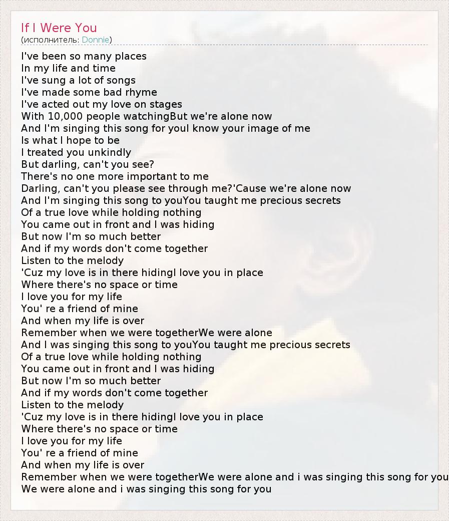 I've been so many places In my life and time I've sung a lot of songs I've made some bad rhyme I've acted out my love on stages With 10,000 people watchingBut we're alone now And I'm singing this song for youI know your image of me Is what I hope to be I treated you unkindly But darling, can't you see? There's no one more important to me Darling, can't you please see through me?'Cause we're alone now And I'm singing this song to youYou taught me precious secrets Of a true love while holding nothing You came out in front and I was hiding But now I'm so much better And if my words don't come together Listen to the melody 'Cuz my love is in there hidingI love you in place Where there's no space or time I love you for my life You' re a friend of mine And when my life is over Remember when we were togetherWe were alone And I was singing this song to youYou taught me precious secrets Of a true love while holding nothing You came out in front and I was hiding But now I'm so much better And if my words don't come together Listen to the melody 'Cuz my love is in there hidingI love you in place Where there's no space or time I love you for my life You' re a friend of mine And when my life is over Remember when we were togetherWe were alone and i was singing this song for you We were alone and i was singing this song for you