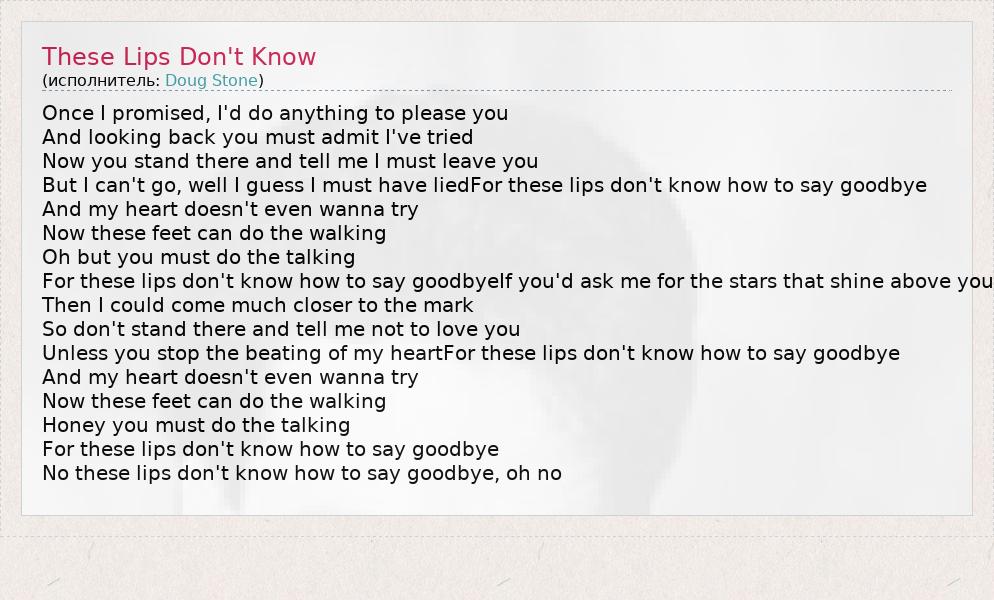 Once I promised, I'd do anything to please you And looking back you must admit I've tried Now you stand there and tell me I must leave you But I can't go, well I guess I must have liedFor these lips don't know how to say goodbye And my heart doesn't even wanna try Now these feet can do the walking Oh but you must do the talking For these lips don't know how to say goodbyeIf you'd ask me for the stars that shine above you Then I could come much closer to the mark So don't stand there and tell me not to love you Unless you stop the beating of my heartFor these lips don't know how to say goodbye And my heart doesn't even wanna try Now these feet can do the walking Honey you must do the talking For these lips don't know how to say goodbye No these lips don't know how to say goodbye, oh no