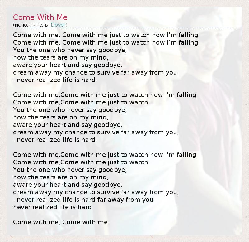 Come with me, Come with me just to watch how I'm falling Come with me, Come with me just to watch how I'm falling You the one who never say goodbye, now the tears are on my mind, aware your heart and say goodbye, dream away my chance to survive far away from you, I never realized life is hard Come with me,Come with me just to watch how I'm falling Come with me,Come with me just to watch You the one who never say goodbye, now the tears are on my mind, aware your heart and say goodbye, dream away my chance to survive far away from you, I never realized life is hard Come with me,Come with me just to watch how I'm falling Come with me,Come with me just to watch You the one who never say goodbye, now the tears are on my mind, aware your heart and say goodbye, dream away my chance to survive far away from you, I never realized life is hard far away from you never realized life is hard Come with me, Come with me.