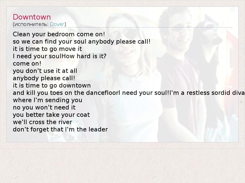Clean your bedroom come on! so we can find your soul anybody please call! it is time to go move it I need your soulHow hard is it? come on! you don't use it at all anybody please call! it is time to go downtown and kill you toes on the dancefloorI need your soul!I'm a restless sordid diva where I'm sending you no you won't need it you better take your coat we'll cross the river don't forget that I'm the leader
