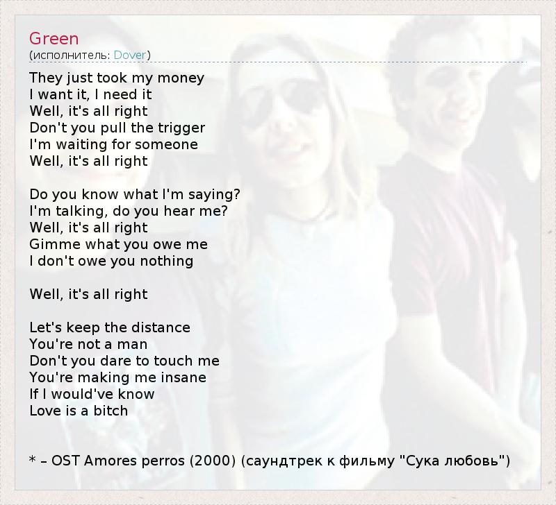 They just took my money I want it, I need it Well, it's all right Don't you pull the trigger I'm waiting for someone Well, it's all right Do you know what I'm saying? I'm talking, do you hear me? Well, it's all right Gimme what you owe me I don't owe you nothing Well, it's all right Let's keep the distance You're not a man Don't you dare to touch me You're making me insane If I would've know Love is a bitch * – OST Amores perros (2000) (саундтрек к фильму "Сука любовь")