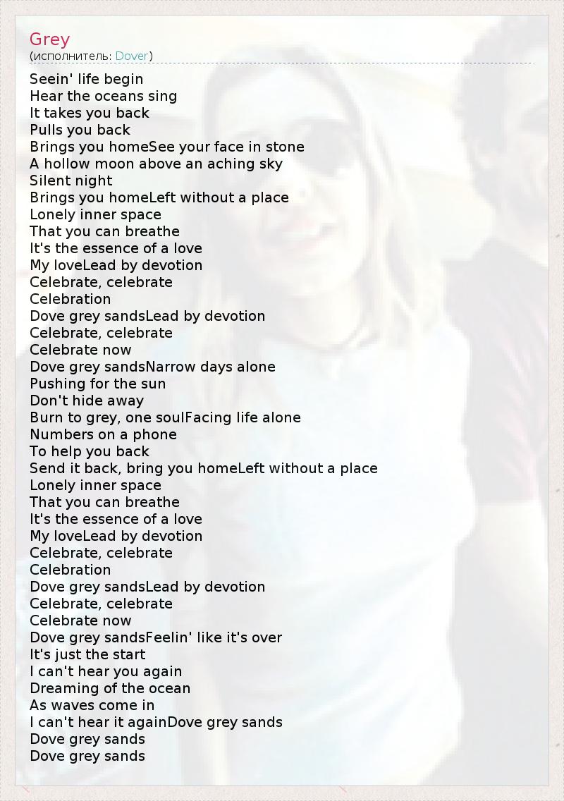 Seein' life begin Hear the oceans sing It takes you back Pulls you back Brings you homeSee your face in stone A hollow moon above an aching sky Silent night Brings you homeLeft without a place Lonely inner space That you can breathe It's the essence of a love My loveLead by devotion Celebrate, celebrate Celebration Dove grey sandsLead by devotion Celebrate, celebrate Celebrate now Dove grey sandsNarrow days alone Pushing for the sun Don't hide away Burn to grey, one soulFacing life alone Numbers on a phone To help you back Send it back, bring you homeLeft without a place Lonely inner space That you can breathe It's the essence of a love My loveLead by devotion Celebrate, celebrate Celebration Dove grey sandsLead by devotion Celebrate, celebrate Celebrate now Dove grey sandsFeelin' like it's over It's just the start I can't hear you again Dreaming of the ocean As waves come in I can't hear it againDove grey sands Dove grey sands Dove grey sands