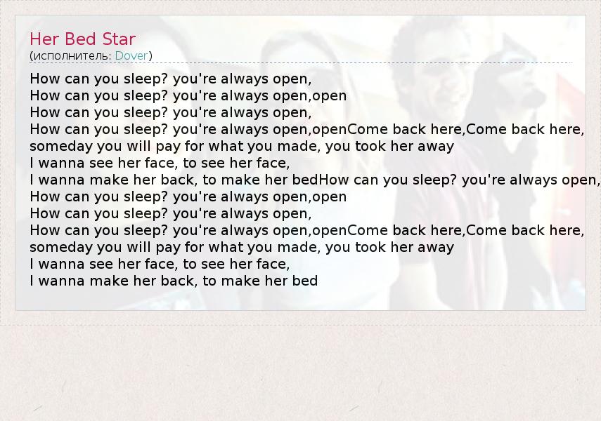 How can you sleep? you're always open, How can you sleep? you're always open,open How can you sleep? you're always open, How can you sleep? you're always open,openCome back here,Come back here, someday you will pay for what you made, you took her away I wanna see her face, to see her face, I wanna make her back, to make her bedHow can you sleep? you're always open, How can you sleep? you're always open,open How can you sleep? you're always open, How can you sleep? you're always open,openCome back here,Come back here, someday you will pay for what you made, you took her away I wanna see her face, to see her face, I wanna make her back, to make her bed