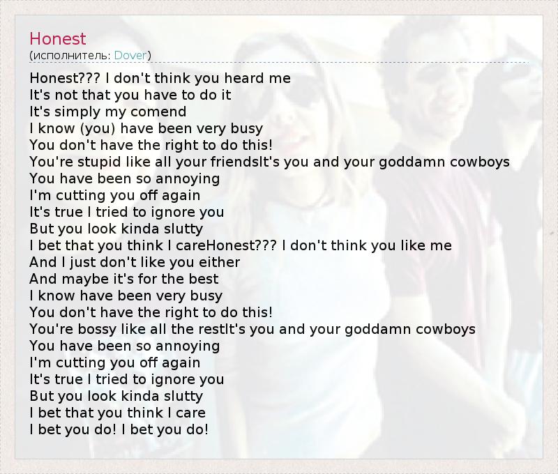 Honest??? I don't think you heard me It's not that you have to do it It's simply my comend I know (you) have been very busy You don't have the right to do this! You're stupid like all your friendsIt's you and your goddamn cowboys You have been so annoying I'm cutting you off again It's true I tried to ignore you But you look kinda slutty I bet that you think I careHonest??? I don't think you like me And I just don't like you either And maybe it's for the best I know have been very busy You don't have the right to do this! You're bossy like all the restIt's you and your goddamn cowboys You have been so annoying I'm cutting you off again It's true I tried to ignore you But you look kinda slutty I bet that you think I care I bet you do! I bet you do!