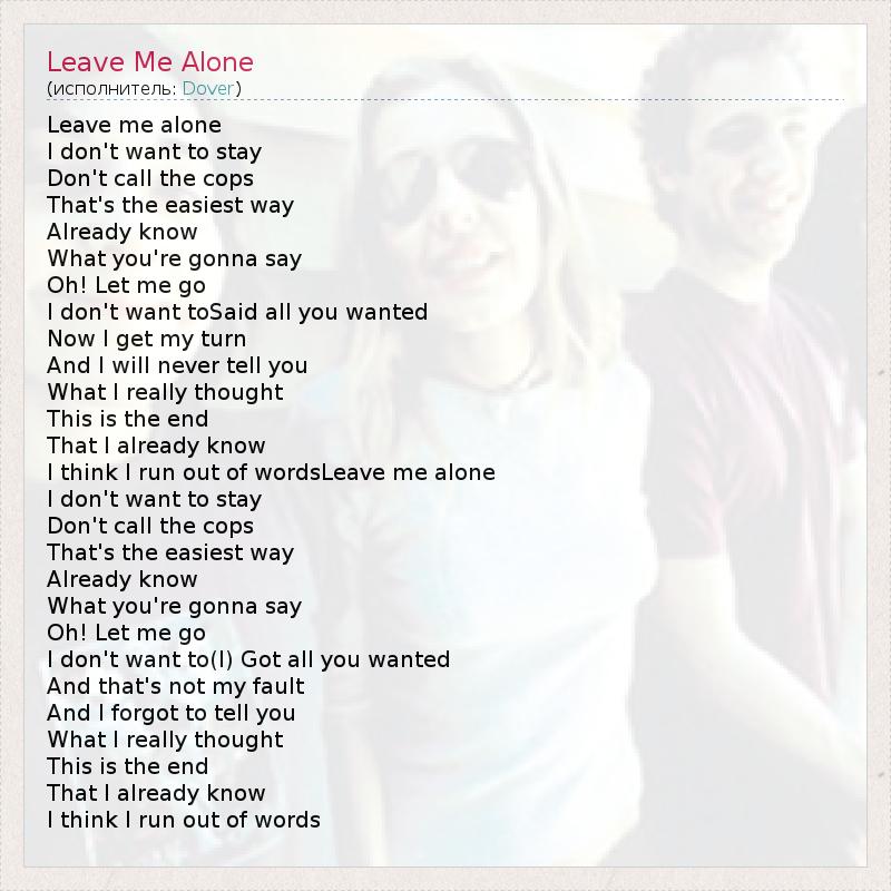 Leave me alone I don't want to stay Don't call the cops That's the easiest way Already know What you're gonna say Oh! Let me go I don't want toSaid all you wanted Now I get my turn And I will never tell you What I really thought This is the end That I already know I think I run out of wordsLeave me alone I don't want to stay Don't call the cops That's the easiest way Already know What you're gonna say Oh! Let me go I don't want to(I) Got all you wanted And that's not my fault And I forgot to tell you What I really thought This is the end That I already know I think I run out of words