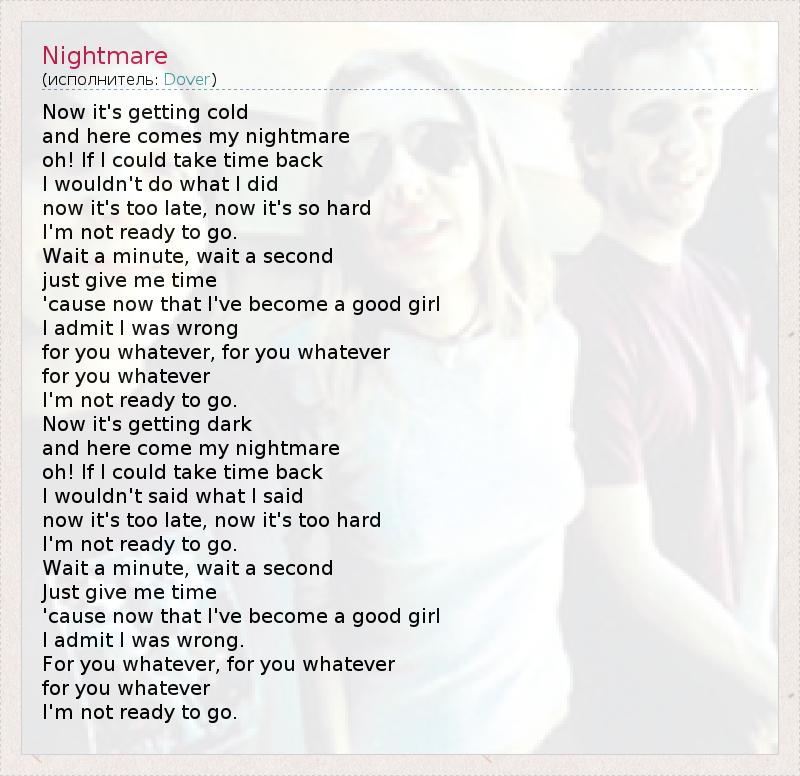 Now it's getting cold and here comes my nightmare oh! If I could take time back I wouldn't do what I did now it's too late, now it's so hard I'm not ready to go. Wait a minute, wait a second just give me time 'cause now that I've become a good girl I admit I was wrong for you whatever, for you whatever for you whatever I'm not ready to go. Now it's getting dark and here come my nightmare oh! If I could take time back I wouldn't said what I said now it's too late, now it's too hard I'm not ready to go. Wait a minute, wait a second Just give me time 'cause now that I've become a good girl I admit I was wrong. For you whatever, for you whatever for you whatever I'm not ready to go.