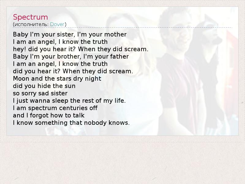 Baby I'm your sister, I'm your mother I am an angel, I know the truth hey! did you hear it? When they did scream. Baby I'm your brother, I'm your father I am an angel, I know the truth did you hear it? When they did scream. Moon and the stars dry night did you hide the sun so sorry sad sister I just wanna sleep the rest of my life. I am spectrum centuries off and I forgot how to talk I know something that nobody knows.