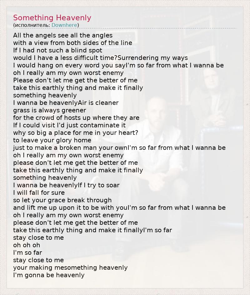 All the angels see all the angles with a view from both sides of the line If I had not such a blind spot would I have a less difficult time?Surrendering my ways I would hang on every word you sayI'm so far from what I wanna be oh I really am my own worst enemy Please don't let me get the better of me take this earthly thing and make it finally something heavenly I wanna be heavenlyAir is cleaner grass is always greener for the crowd of hosts up where they are If I could visit I'd just contaminate it why so big a place for me in your heart? to leave your glory home just to make a broken man your ownI'm so far from what I wanna be oh I really am my own worst enemy please don't let me get the better of me take this earthly thing and make it finally something heavenly I wanna be heavenlyIf I try to soar I will fall for sure so let your grace break through and lift me up upon it to be with youI'm so far from what I wanna be oh I really am my own worst enemy please don't let me get the better of me take this earthly thing and make it finallyI'm so far stay close to me oh oh oh I'm so far stay close to me your making mesomething heavenly I'm gonna be heavenly