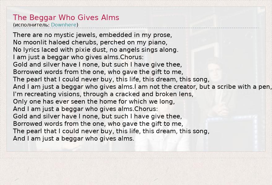 There are no mystic jewels, embedded in my prose, No moonlit haloed cherubs, perched on my piano, No lyrics laced with pixie dust, no angels sings along. I am just a beggar who gives alms.Chorus: Gold and silver have I none, but such I have give thee, Borrowed words from the one, who gave the gift to me, The pearl that I could never buy, this life, this dream, this song, And I am just a beggar who gives alms.I am not the creator, but a scribe with a pen, I'm recreating visions, through a cracked and broken lens, Only one has ever seen the home for which we long, And I am just a beggar who gives alms.Chorus: Gold and silver have I none, but such I have give thee, Borrowed words from the one, who gave the gift to me, The pearl that I could never buy, this life, this dream, this song, And I am just a beggar who gives alms.