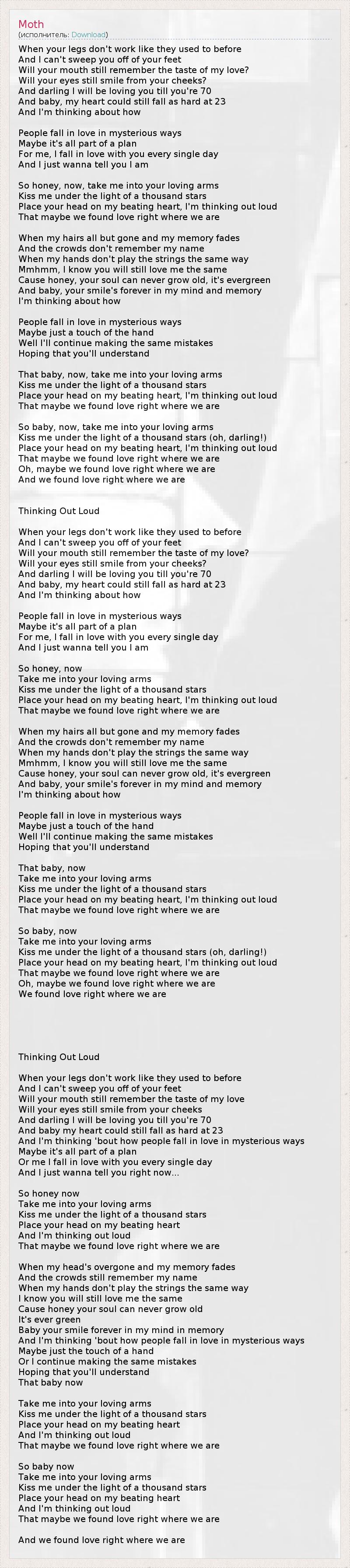 When your legs don't work like they used to before And I can't sweep you off of your feet Will your mouth still remember the taste of my love? Will your eyes still smile from your cheeks? And darling I will be loving you till you're 70 And baby, my heart could still fall as hard at 23 And I'm thinking about how People fall in love in mysterious ways Maybe it's all part of a plan For me, I fall in love with you every single day And I just wanna tell you I am So honey, now, take me into your loving arms Kiss me under the light of a thousand stars Place your head on my beating heart, I'm thinking out loud That maybe we found love right where we are When my hairs all but gone and my memory fades And the crowds don't remember my name When my hands don't play the strings the same way Mmhmm, I know you will still love me the same Cause honey, your soul can never grow old, it's evergreen And baby, your smile's forever in my mind and memory I'm thinking about how People fall in love in mysterious ways Maybe just a touch of the hand Well I'll continue making the same mistakes Hoping that you'll understand That baby, now, take me into your loving arms Kiss me under the light of a thousand stars Place your head on my beating heart, I'm thinking out loud That maybe we found love right where we are So baby, now, take me into your loving arms Kiss me under the light of a thousand stars (oh, darling!) Place your head on my beating heart, I'm thinking out loud That maybe we found love right where we are Oh, maybe we found love right where we are And we found love right where we are Thinking Out Loud When your legs don't work like they used to before And I can't sweep you off of your feet Will your mouth still remember the taste of my love? Will your eyes still smile from your cheeks? And darling I will be loving you till you're 70 And baby, my heart could still fall as hard at 23 And I'm thinking about how People fall in love in mysterious ways Maybe it's all part of a plan For me, I fall in love with you every single day And I just wanna tell you I am So honey, now Take me into your loving arms Kiss me under the light of a thousand stars Place your head on my beating heart, I'm thinking out loud That maybe we found love right where we are When my hairs all but gone and my memory fades And the crowds don't remember my name When my hands don't play the strings the same way Mmhmm, I know you will still love me the same Cause honey, your soul can never grow old, it's evergreen And baby, your smile's forever in my mind and memory I'm thinking about how People fall in love in mysterious ways Maybe just a touch of the hand Well I'll continue making the same mistakes Hoping that you'll understand That baby, now Take me into your loving arms Kiss me under the light of a thousand stars Place your head on my beating heart, I'm thinking out loud That maybe we found love right where we are So baby, now Take me into your loving arms Kiss me under the light of a thousand stars (oh, darling!) Place your head on my beating heart, I'm thinking out loud That maybe we found love right where we are Oh, maybe we found love right where we are We found love right where we are Thinking Out Loud When your legs don't work like they used to before And I can't sweep you off of your feet Will your mouth still remember the taste of my love Will your eyes still smile from your cheeks And darling I will be loving you till you're 70 And baby my heart could still fall as hard at 23 And I'm thinking 'bout how people fall in love in mysterious ways Maybe it's all part of a plan Or me I fall in love with you every single day And I just wanna tell you right now... So honey now Take me into your loving arms Kiss me under the light of a thousand stars Place your head on my beating heart And I'm thinking out loud That maybe we found love right where we are When my head's overgone and my memory fades And the crowds still remember my name When my hands don't play the strings the same way I know you will still love me the same Cause honey your soul can never grow old It's ever green Baby your smile forever in my mind in memory And I'm thinking 'bout how people fall in love in mysterious ways Maybe just the touch of a hand Or I continue making the same mistakes Hoping that you'll understand That baby now Take me into your loving arms Kiss me under the light of a thousand stars Place your head on my beating heart And I'm thinking out loud That maybe we found love right where we are So baby now Take me into your loving arms Kiss me under the light of a thousand stars Place your head on my beating heart And I'm thinking out loud That maybe we found love right where we are And we found love right where we are