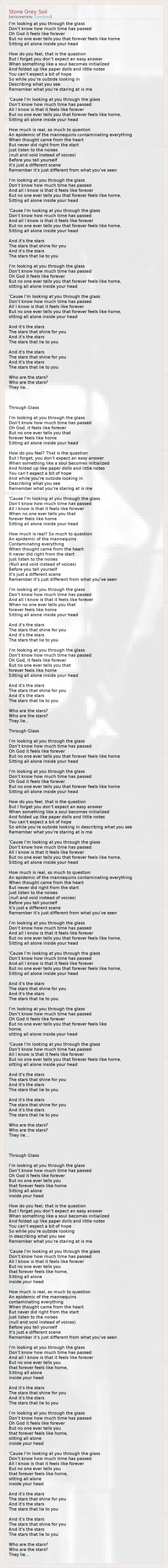I'm looking at you through the glass Don't know how much time has passed Oh God it feels like forever But no one ever tells you that forever feels like home Sitting all alone inside your head How do you feel, that is the question But I forget you don't expect an easy answer When something like a soul becomes initialized And folded up like paper dolls and little notes You can't expect a bit of hope So while you're outside looking in Describing what you see Remember what you're staring at is me 'Cause I'm looking at you through the glass Don't know how much time has passed All I know is that it feels like forever But no one ever tells you that forever feels like home, Sitting all alone inside your head How much is real, so much to question An epidemic of the mannequins contaminating everything When thought came from the heart But never did right from the start Just listen to the noises (null and void instead of voices) Before you tell yourself It's just a different scene Remember it's just different from what you've seen I'm looking at you through the glass Don't know how much time has passed And all I know is that it feels like forever But no one ever tells you that forever feels like home, Sitting all alone inside your head 'Cause I'm looking at you through the glass Don't know how much time has passed And all I know is that it feels like forever But no one ever tells you that forever feels like home, Sitting all alone inside your head And it's the stars The stars that shine for you And it's the stars The stars that lie to you I'm looking at you through the glass Don't know how much time has passed Oh God it feels like forever But no one ever tells you that forever feels like home, sitting all alone inside your head 'Cause I'm looking at you through the glass Don't know how much time has passed All I know is that it feels like forever But no one ever tells you that forever feels like home, sitting all alone inside your head And it's the stars The stars that shine for you And it's the stars The stars that lie to you And it's the stars The stars that shine for you And it's the stars The stars that lie to you Who are the stars? Who are the stars? They lie… Through Glass I'm looking at you through the glass Don't know how much time has passed Oh God, it feels like forever But no one ever tells you that forever feels like home Sitting all alone inside your head How do you feel? That is the question But I forget, you don't expect an easy answer When something like a soul becomes initialized And folded up like paper dolls and little notes You can't expect a bit of hope And while you're outside looking in Describing what you see Remember what you're staring at is me 'Cause I'm looking at you through the glass Don't know how much time has passed All I know is that it feels like forever When no one ever tells you that forever feels like home Sitting all alone inside your head How much is real? So much to question An epidemic of the mannequins Contaminating everything When thought came from the heart It never did right from the start Just listen to the noises (Null and void instead of voices) Before you tell yourself It's just a different scene Remember it's just different from what you've seen I'm looking at you through the glass Don't know how much time has passed And all I know is that it feels like forever When no one ever tells you that forever feels like home Sitting all alone inside your head And it's the stars The stars that shine for you And it's the stars The stars that lie to you I'm looking at you through the glass Don't know how much time has passed Oh God, it feels like forever But no one ever tells you that forever feels like home Sitting all alone inside your head And it's the stars The stars that shine for you And it's the stars The stars that lie to you Who are the stars? Who are the stars? They lie... Through Glass I'm looking at you through the glass Don't know how much time has passed Oh God it feels like forever But no one ever tells you that forever feels like home Sitting all alone inside your head I'm looking at you through the glass Don't know how much time has passed Oh God it feels like forever But no one ever tells you that forever feels like home Sitting all alone inside your head How do you feel, that is the question But I forget you don't expect an easy answer When something like a soul becomes initialized And folded up like paper dolls and little notes You can't expect a bit of hope So while you're outside looking in describing what you see Remember what you're staring at is me 'Cause I'm looking at you through the glass Don't know how much time has passed All I know is that it feels like forever But no one ever tells you that forever feels like home, Sitting all alone inside your head How much is real, so much to question An epidemic of the mannequins contaminating everything When thought came from the heart But never did right from the start Just listen to the noises (null and void instead of voices) Before you tell yourself It's just a different scene Remember it's just different from what you've seen I'm looking at you through the glass Don't know how much time has passed And all I know is that it feels like forever But no one ever tells you that forever feels like home, Sitting all alone inside your head 'Cause I'm looking at you through the glass Don't know how much time has passed And all I know is that it feels like forever But no one ever tells you that forever feels like home, Sitting all alone inside your head And it's the stars The stars that shine for you And it's the stars The stars that lie to you I'm looking at you through the glass Don't know how much time has passed Oh God it feels like forever But no one ever tells you that forever feels like home, sitting all alone inside your head 'Cause I'm looking at you through the glass Don't know how much time has passed All I know is that it feels like forever But no one ever tells you that forever feels