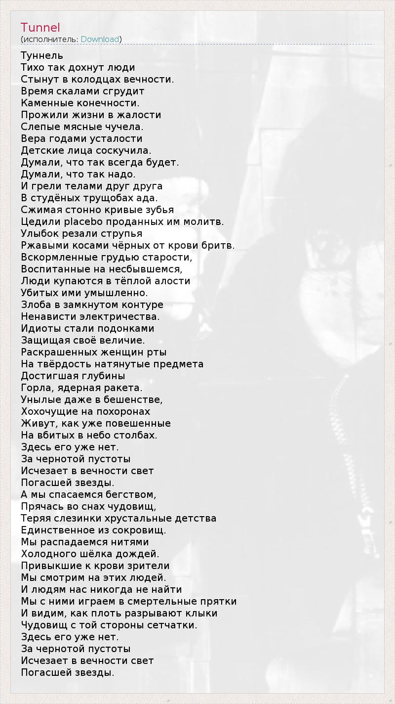 Туннель Тихо так дохнут люди Стынут в колодцах вечности. Время скалами сгрудит Каменные конечности. Прожили жизни в жалости Слепые мясные чучела. Вера годами усталости Детские лица соскучила. Думали, что так всегда будет. Думали, что так надо. И грели телами друг друга В студёных трущобах ада. Сжимая стонно кривые зубья Цедили placebo проданных им молитв. Улыбок резали струпья Ржавыми косами чёрных от крови бритв. Вскормленные грудью старости, Воспитанные на несбывшемся, Люди купаются в тёплой алости Убитых ими умышленно. Злоба в замкнутом контуре Ненависти электричества. Идиоты стали подонками Защищая своё величие. Раскрашенных женщин рты На твёрдость натянутые предмета Достигшая глубины Горла, ядерная ракета. Унылые даже в бешенстве, Хохочущие на похоронах Живут, как уже повешенные На вбитых в небо столбах. Здесь его уже нет. За чернотой пустоты Исчезает в вечности свет Погасшей звезды. А мы спасаемся бегством, Прячась во снах чудовищ, Теряя слезинки хрустальные детства Единственное из сокровищ. Мы распадаемся нитями Холодного шёлка дождей. Привыкшие к крови зрители Мы смотрим на этих людей. И людям нас никогда не найти Мы с ними играем в смертельные прятки И видим, как плоть разрывают клыки Чудовищ с той стороны сетчатки. Здесь его уже нет. За чернотой пустоты Исчезает в вечности свет Погасшей звезды.