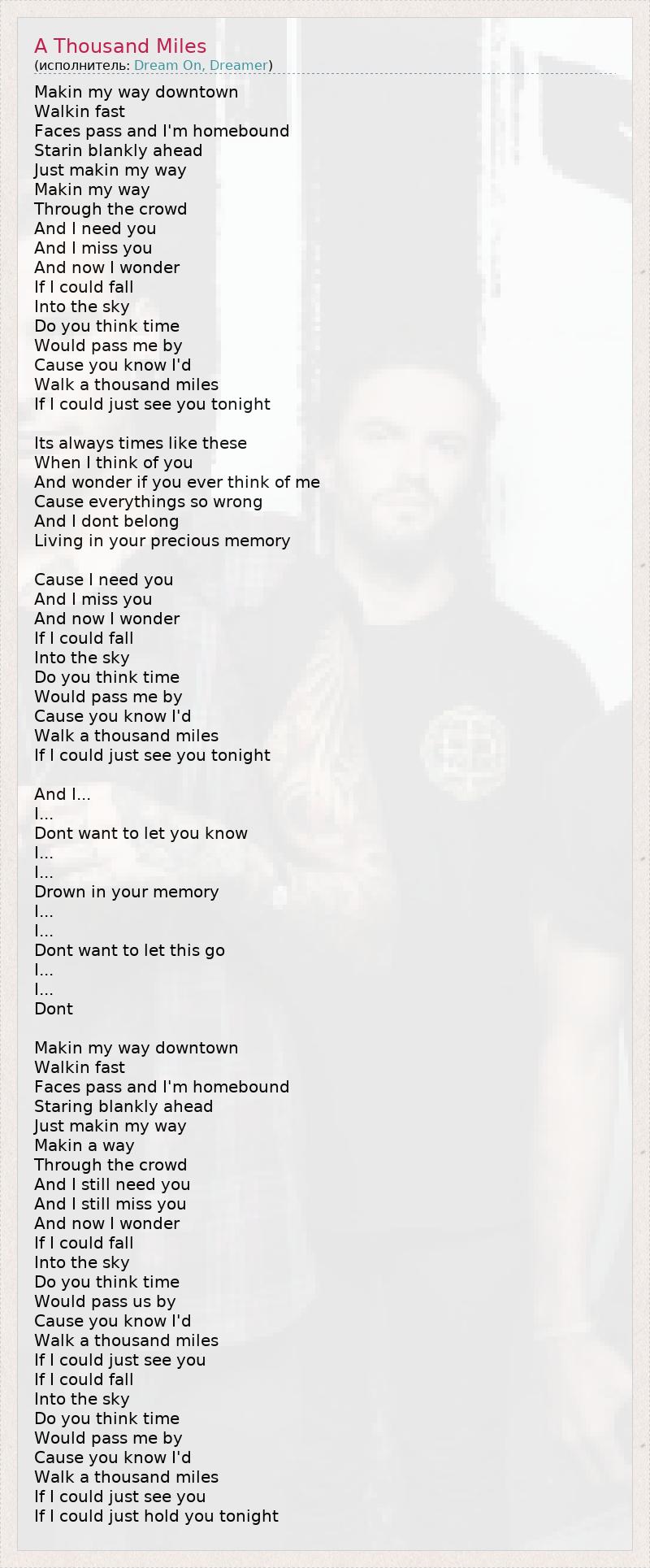 Makin my way downtown Walkin fast Faces pass and I'm homebound Starin blankly ahead Just makin my way Makin my way Through the crowd And I need you And I miss you And now I wonder If I could fall Into the sky Do you think time Would pass me by Cause you know I'd Walk a thousand miles If I could just see you tonight Its always times like these When I think of you And wonder if you ever think of me Cause everythings so wrong And I dont belong Living in your precious memory Cause I need you And I miss you And now I wonder If I could fall Into the sky Do you think time Would pass me by Cause you know I'd Walk a thousand miles If I could just see you tonight And I... I... Dont want to let you know I... I... Drown in your memory I... I... Dont want to let this go I... I... Dont Makin my way downtown Walkin fast Faces pass and I'm homebound Staring blankly ahead Just makin my way Makin a way Through the crowd And I still need you And I still miss you And now I wonder If I could fall Into the sky Do you think time Would pass us by Cause you know I'd Walk a thousand miles If I could just see you If I could fall Into the sky Do you think time Would pass me by Cause you know I'd Walk a thousand miles If I could just see you If I could just hold you tonight