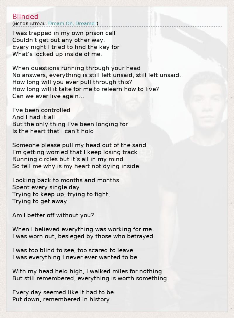 I was trapped in my own prison cell Couldn’t get out any other way. Every night I tried to find the key for What’s locked up inside of me. When questions running through your head No answers, everything is still left unsaid, still left unsaid. How long will you ever pull through this? How long will it take for me to relearn how to live? Can we ever live again… I’ve been controlled And I had it all But the only thing I’ve been longing for Is the heart that I can’t hold Someone please pull my head out of the sand I’m getting worried that I keep losing track Running circles but it’s all in my mind So tell me why is my heart not dying inside Looking back to months and months Spent every single day Trying to keep up, trying to fight, Trying to get away. Am I better off without you? When I believed everything was working for me. I was worn out, besieged by those who betrayed. I was too blind to see, too scared to leave. I was everything I never ever wanted to be. With my head held high, I walked miles for nothing. But still remembered, everything is worth something. Every day seemed like it had to be Put down, remembered in history.