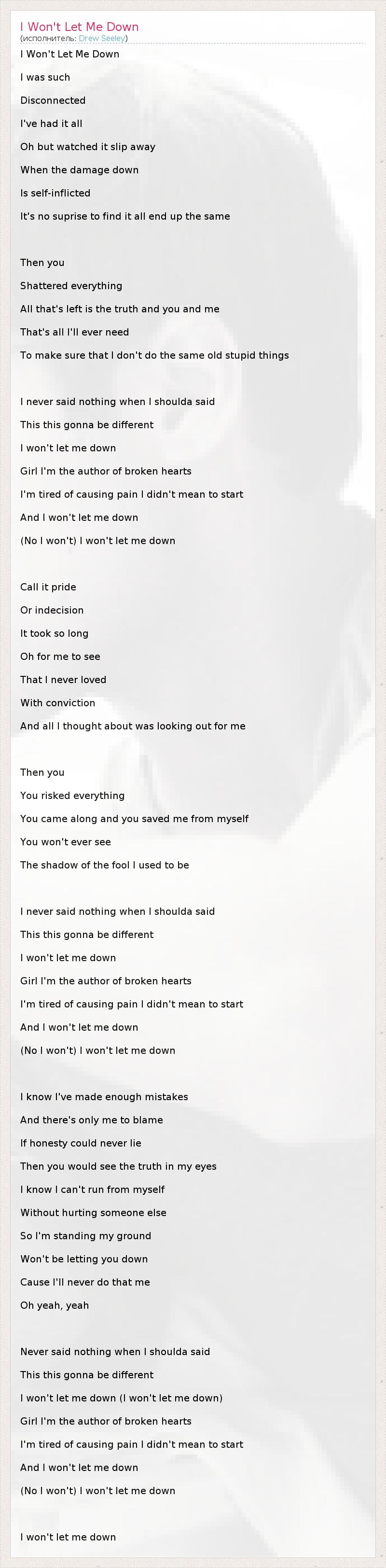 I Won't Let Me Down I was such Disconnected I've had it all Oh but watched it slip away When the damage down Is self-inflicted It's no suprise to find it all end up the same Then you Shattered everything All that's left is the truth and you and me That's all I'll ever need To make sure that I don't do the same old stupid things I never said nothing when I shoulda said This this gonna be different I won't let me down Girl I'm the author of broken hearts I'm tired of causing pain I didn't mean to start And I won't let me down (No I won't) I won't let me down Call it pride Or indecision It took so long Oh for me to see That I never loved With conviction And all I thought about was looking out for me Then you You risked everything You came along and you saved me from myself You won't ever see The shadow of the fool I used to be I never said nothing when I shoulda said This this gonna be different I won't let me down Girl I'm the author of broken hearts I'm tired of causing pain I didn't mean to start And I won't let me down (No I won't) I won't let me down I know I've made enough mistakes And there's only me to blame If honesty could never lie Then you would see the truth in my eyes I know I can't run from myself Without hurting someone else So I'm standing my ground Won't be letting you down Cause I'll never do that me Oh yeah, yeah Never said nothing when I shoulda said This this gonna be different I won't let me down (I won't let me down) Girl I'm the author of broken hearts I'm tired of causing pain I didn't mean to start And I won't let me down (No I won't) I won't let me down I won't let me down