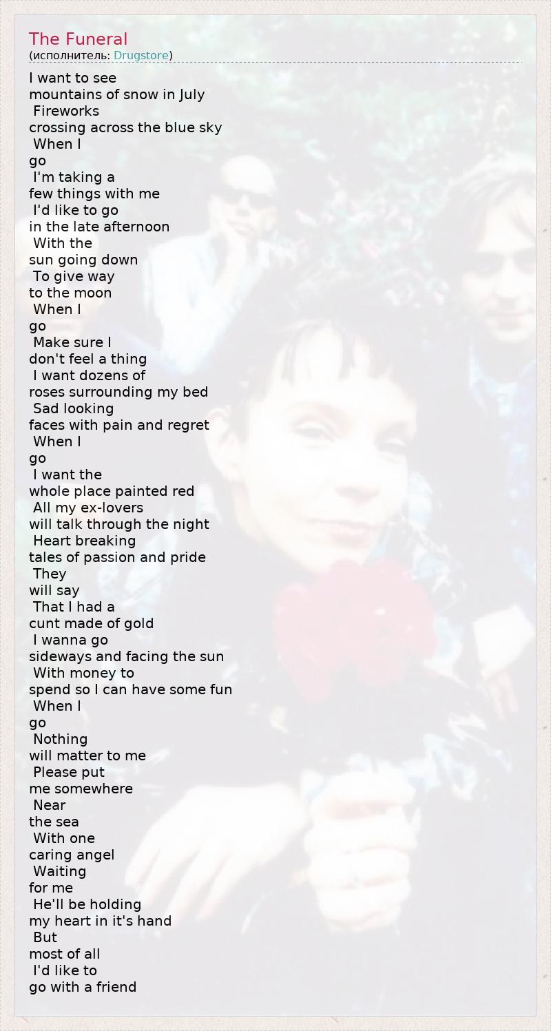 I want to see mountains of snow in July Fireworks crossing across the blue sky When I go I'm taking a few things with me I'd like to go in the late afternoon With the sun going down To give way to the moon When I go Make sure I don't feel a thing I want dozens of roses surrounding my bed Sad looking faces with pain and regret When I go I want the whole place painted red All my ex-lovers will talk through the night Heart breaking tales of passion and pride They will say That I had a cunt made of gold I wanna go sideways and facing the sun With money to spend so I can have some fun When I go Nothing will matter to me Please put me somewhere Near the sea With one caring angel Waiting for me He'll be holding my heart in it's hand But most of all I'd like to go with a friend