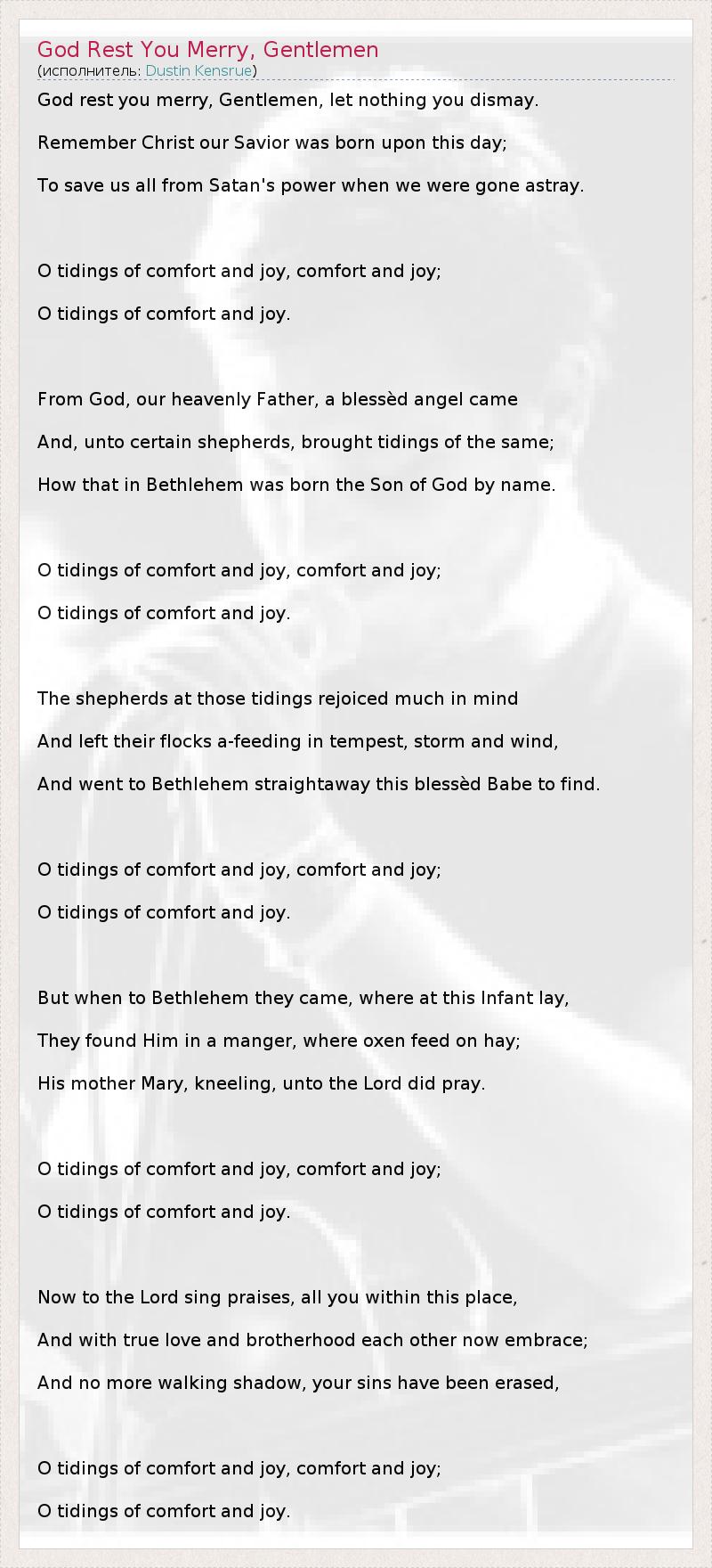God rest you merry, Gentlemen, let nothing you dismay. Remember Christ our Savior was born upon this day; To save us all from Satan's power when we were gone astray. O tidings of comfort and joy, comfort and joy; O tidings of comfort and joy. From God, our heavenly Father, a blessèd angel came And, unto certain shepherds, brought tidings of the same; How that in Bethlehem was born the Son of God by name. O tidings of comfort and joy, comfort and joy; O tidings of comfort and joy. The shepherds at those tidings rejoiced much in mind And left their flocks a-feeding in tempest, storm and wind, And went to Bethlehem straightaway this blessèd Babe to find. O tidings of comfort and joy, comfort and joy; O tidings of comfort and joy. But when to Bethlehem they came, where at this Infant lay, They found Him in a manger, where oxen feed on hay; His mother Mary, kneeling, unto the Lord did pray. O tidings of comfort and joy, comfort and joy; O tidings of comfort and joy. Now to the Lord sing praises, all you within this place, And with true love and brotherhood each other now embrace; And no more walking shadow, your sins have been erased, O tidings of comfort and joy, comfort and joy; O tidings of comfort and joy.
